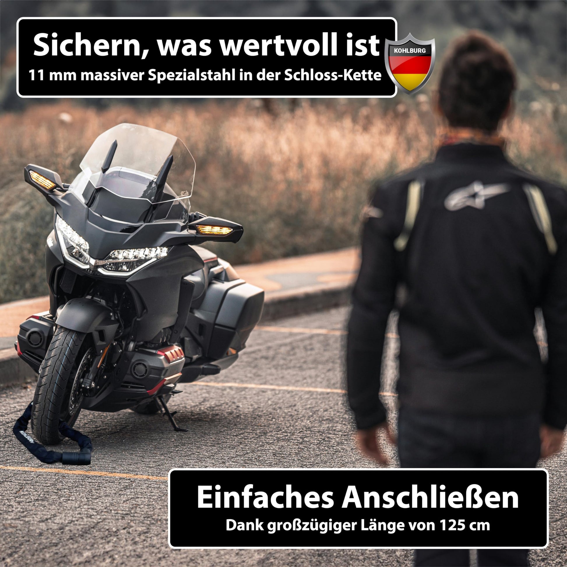 Die aussergewöhnliche Länge von 125 cm gibt Ihnen die Freiheit, Ihr Motorrad, Ihren Roller oder Ihr E-Bike flexibel zu sichern. Selbst an dicken Objekten oder zusammen mit einem zweiten Fahrzeug finden Sie immer eine passende Befestigungsmöglichkeit.