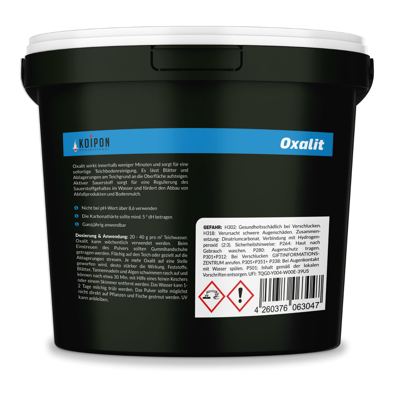 KOIPON Oxalit ist ein Granulat auf Basis von Aktivsauerstoff. Sobald es den Teichgrund erreicht, setzt es Sauerstoff frei. Dieser Prozess zersetzt organische Ablagerungen wie Schlamm und Laub und transportiert die Überreste an die Wasseroberfläche, wo sie einfach mit einem Kescher entfernt werden können.