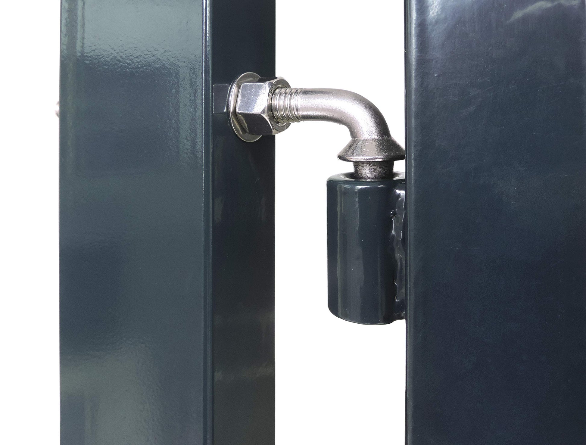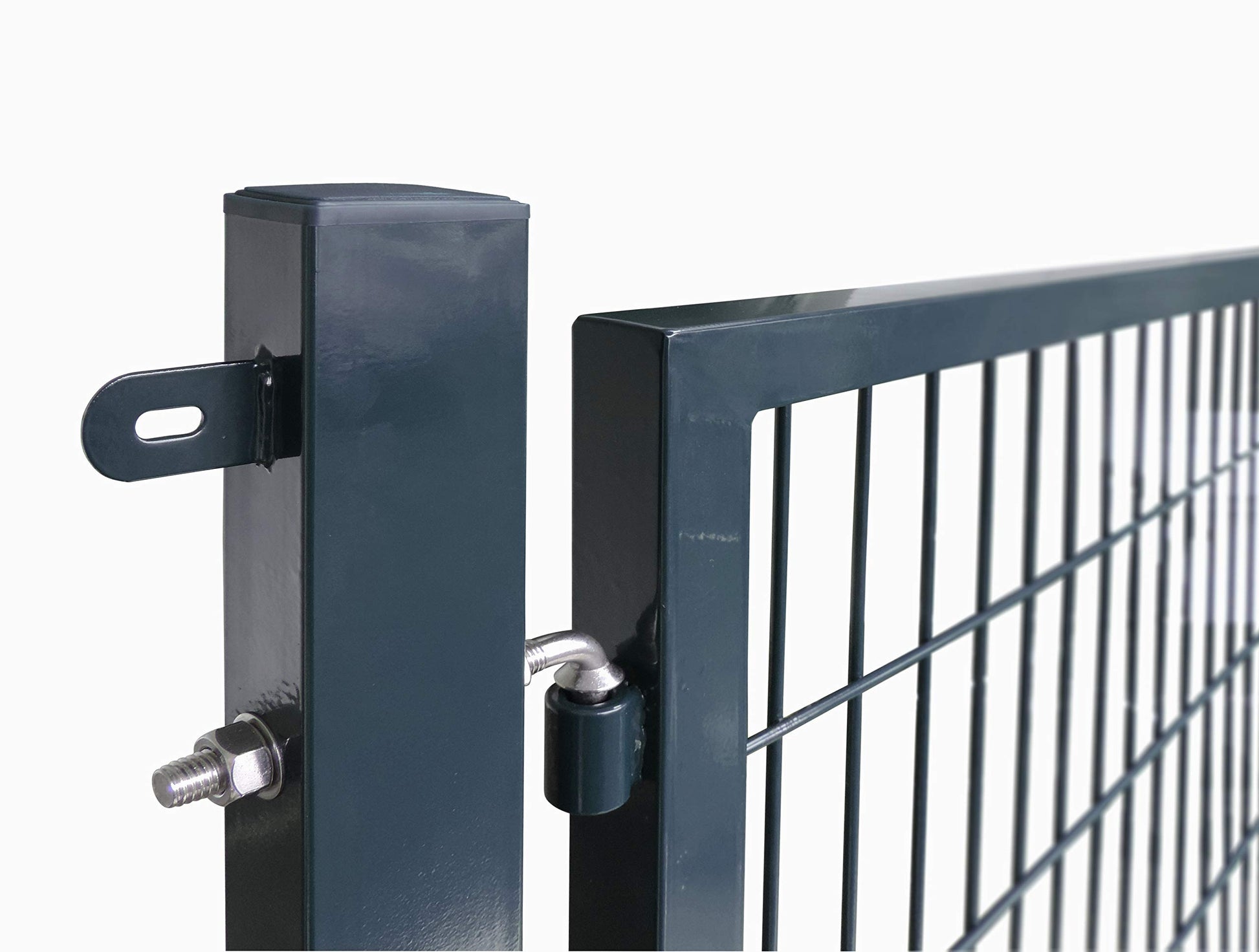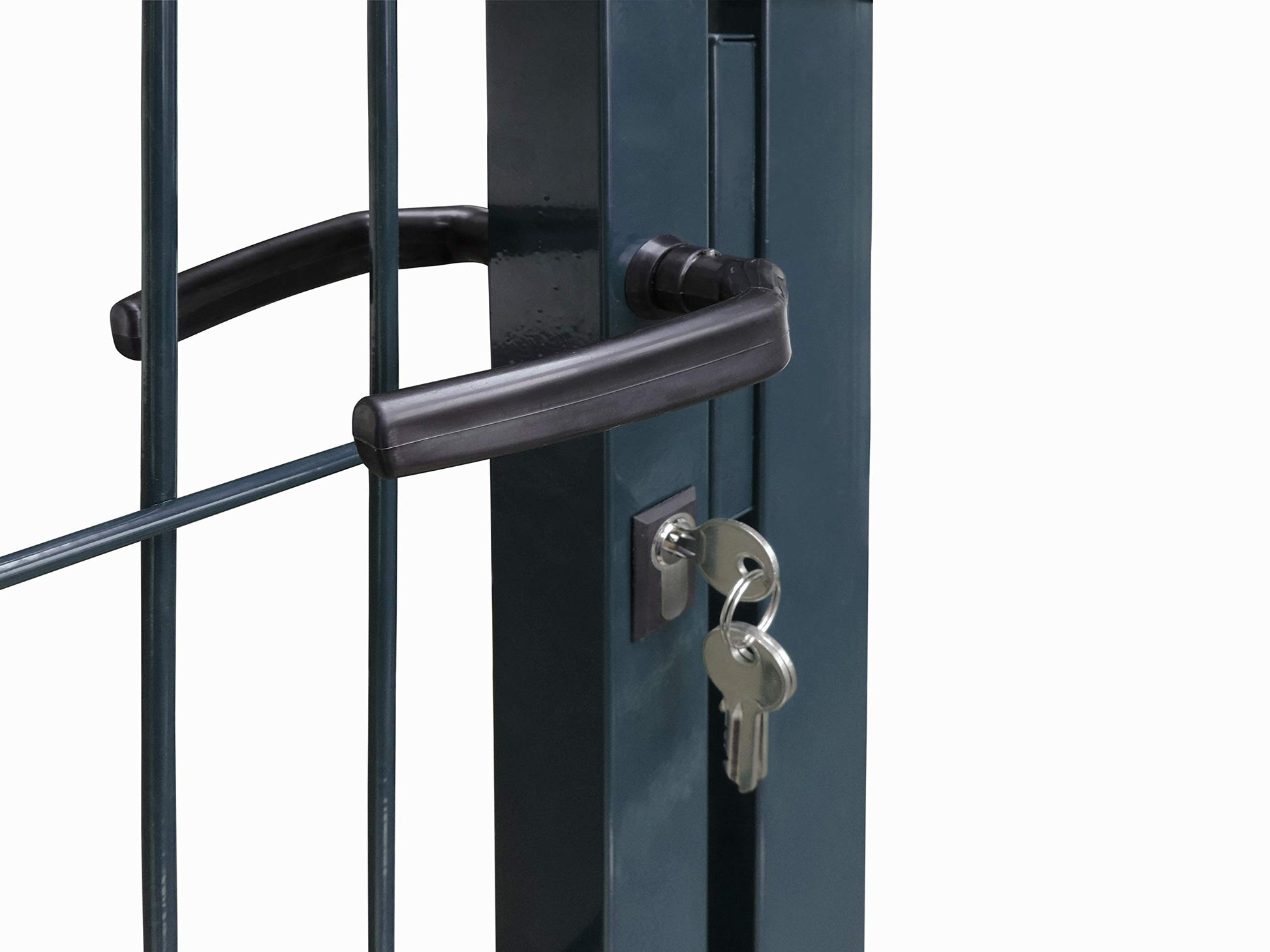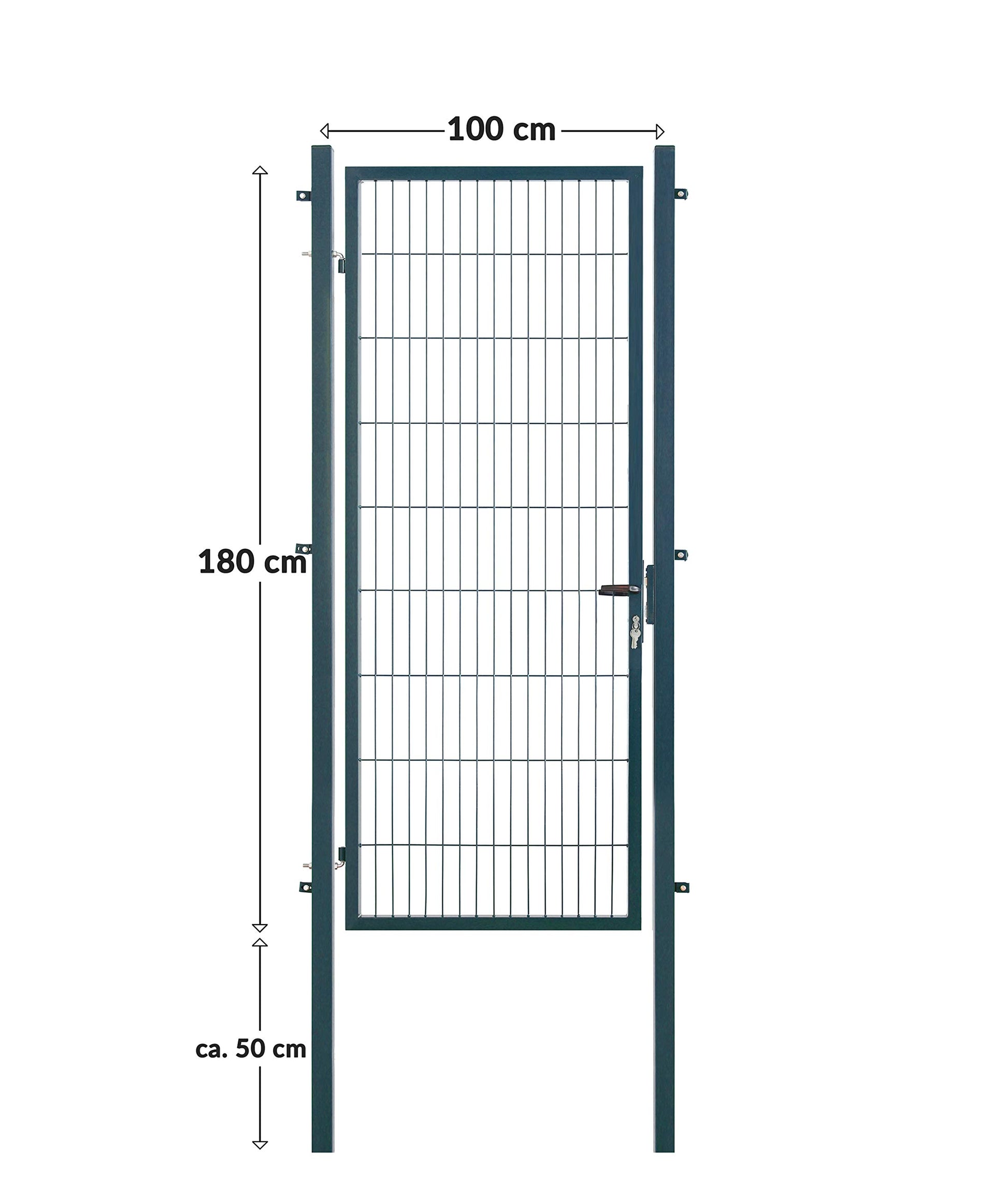 Das Tor ist in den beliebten Zaunfarben Anthrazit (RAL 7016) und Moosgrün (RAL 6005) verfügbar. Sie können aus sieben verschiedenen Höhen von 80 cm bis 200 cm wählen, um es exakt auf die Höhe Ihres Stabmattenzauns abzustimmen. Die lichte Durchgangsbreite beträgt ca. 100 cm.