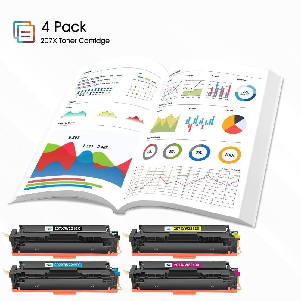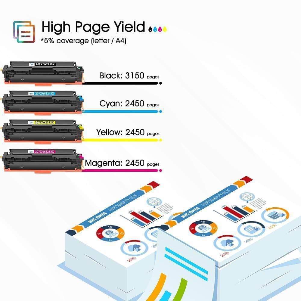 - Komplett-Set: Beinhaltet vier Kartuschen als Ersatz für HP 207X / 207A – je eine in Schwarz (W2210X), Cyan (W2211X), Gelb (W2212X) und Magenta (W2213X).