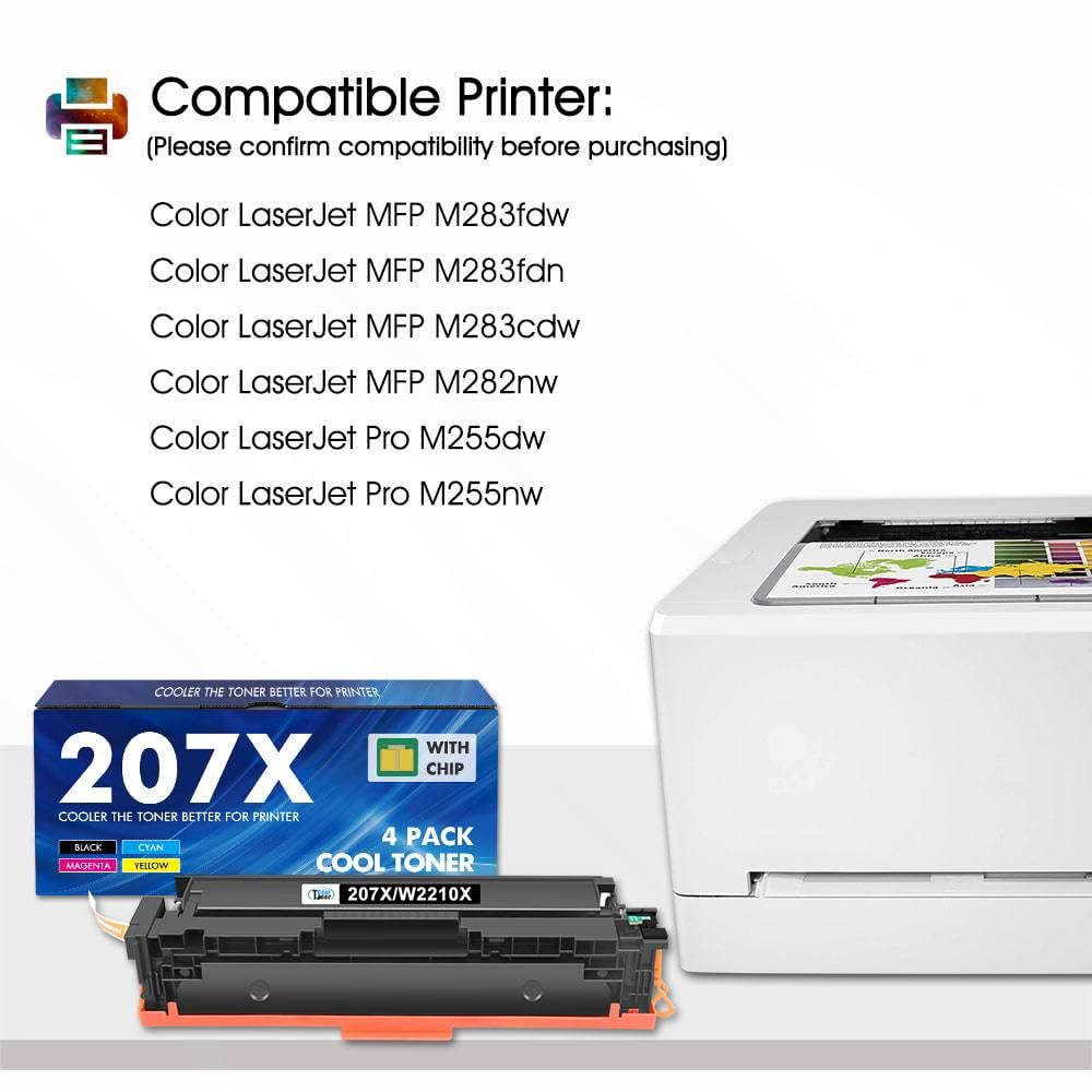 Dieses Komplett-Set beinhaltet vier Tonerkartuschen (Schwarz, Cyan, Gelb, Magenta) als Ersatz für HP 207X / 207A und ist vollständig kompatibel mit den HP Color LaserJet Pro Modellen M255dw, M255nw, MFP M282nw, MFP M283fdn und MFP M283fdw.