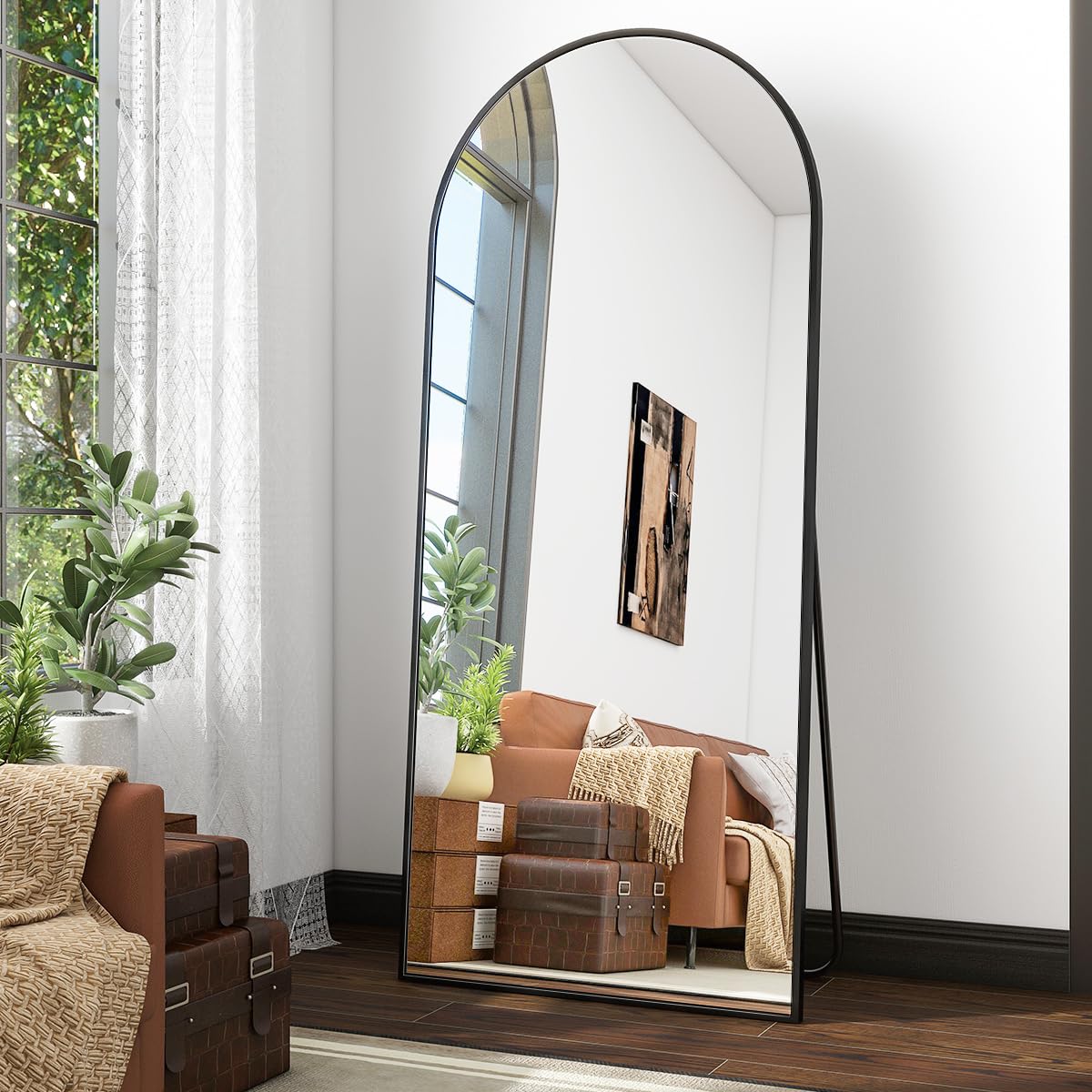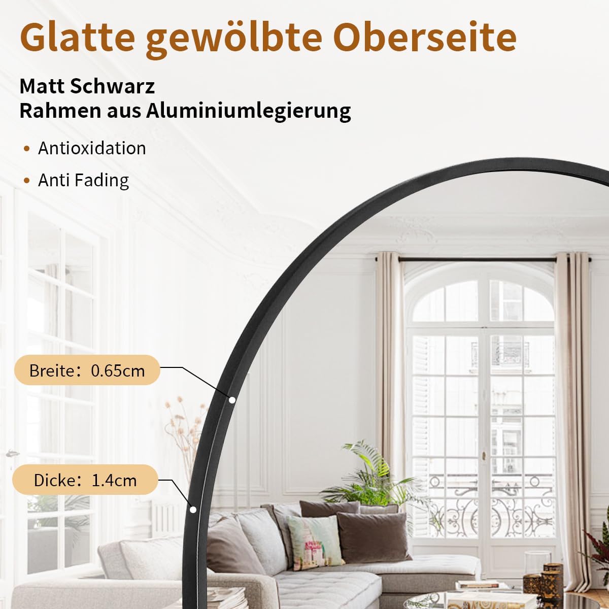 Verleihen Sie Ihrem Raum Eleganz und Tiefe mit diesem grosszügigen Standspiegel. Sein modernes Design mit der sanft gewölbten Oberkante macht ihn zu einem stilvollen Blickfang in jedem Zimmer.