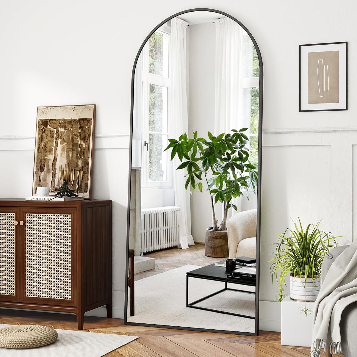 - Elegantes Design: Die charakteristische Bogenform an der Oberseite und der schmale, schwarze Rahmen aus einer Aluminiumlegierung verleihen dem Spiegel eine hochwertige, moderne Ästhetik.