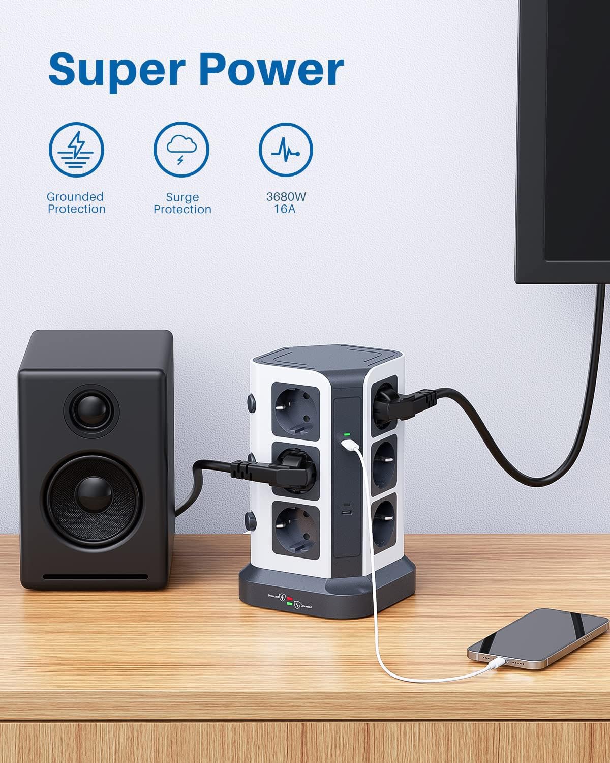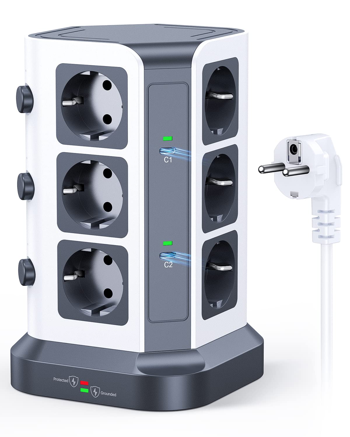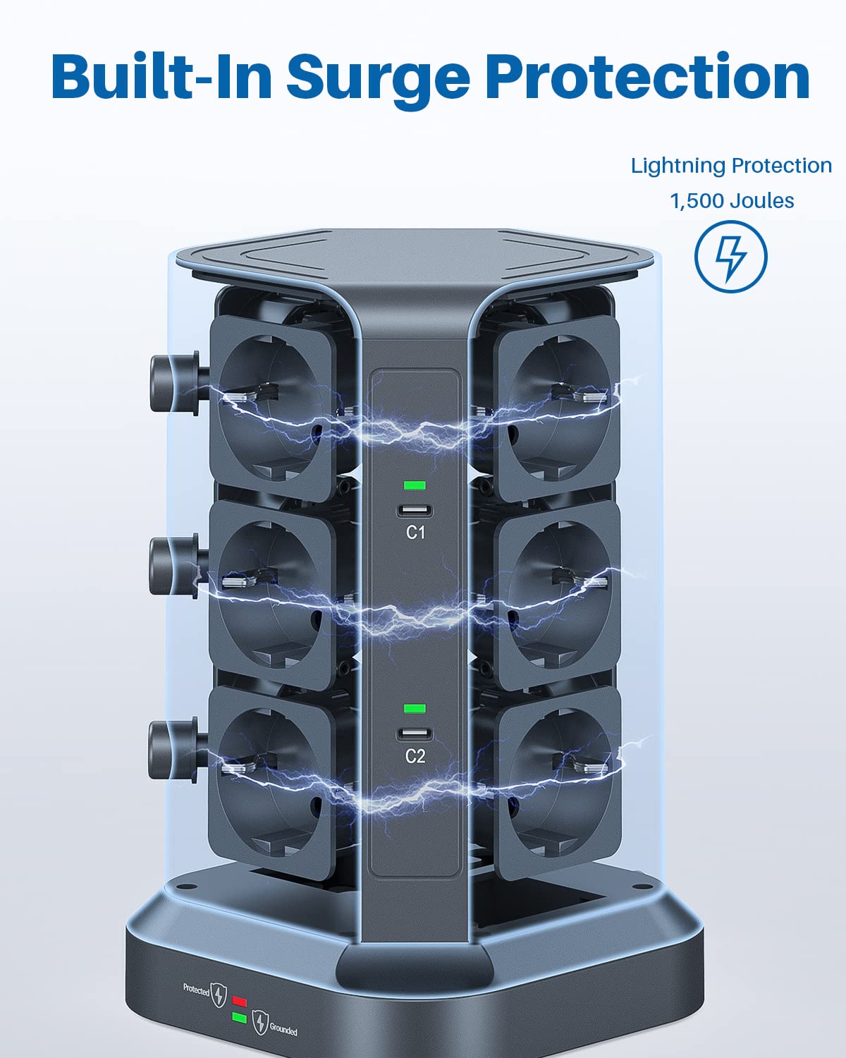 Der Turm bietet doppelten Schutz: Ein 1500-Joule-Überspannungsschutz sichert Ihre Geräte vor plötzlichen Spannungsspitzen, z.B. bei Gewittern. Zusätzlich schaltet ein Überlastungsschutz die Stromzufuhr automatisch ab, falls die Gesamtleistung 3680W übersteigt, um Schäden zu verhindern.