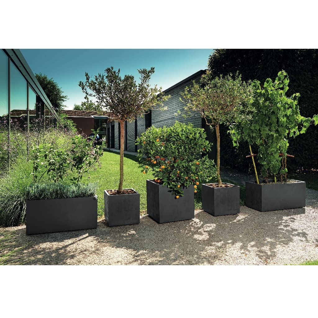 Der Pflanzkasten ist in vier Varianten verfügbar: Als quadratischer Kübel mit 40 Litern (39x39x39 cm) oder 80 Litern (49x49x49 cm) sowie als rechteckiger Kasten mit 73 Litern (78x39x39 cm) oder 100 Litern (99x37,5x37,5 cm), jeweils in den Farben Braun, Anthrazit und Grau.