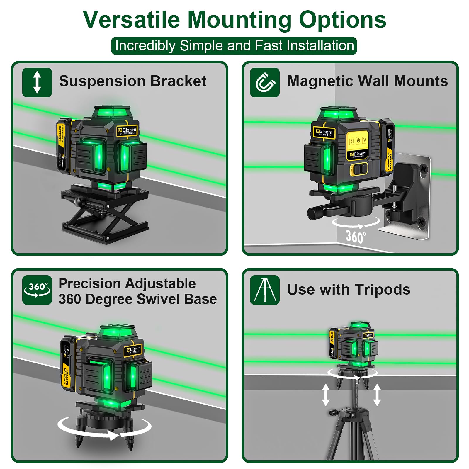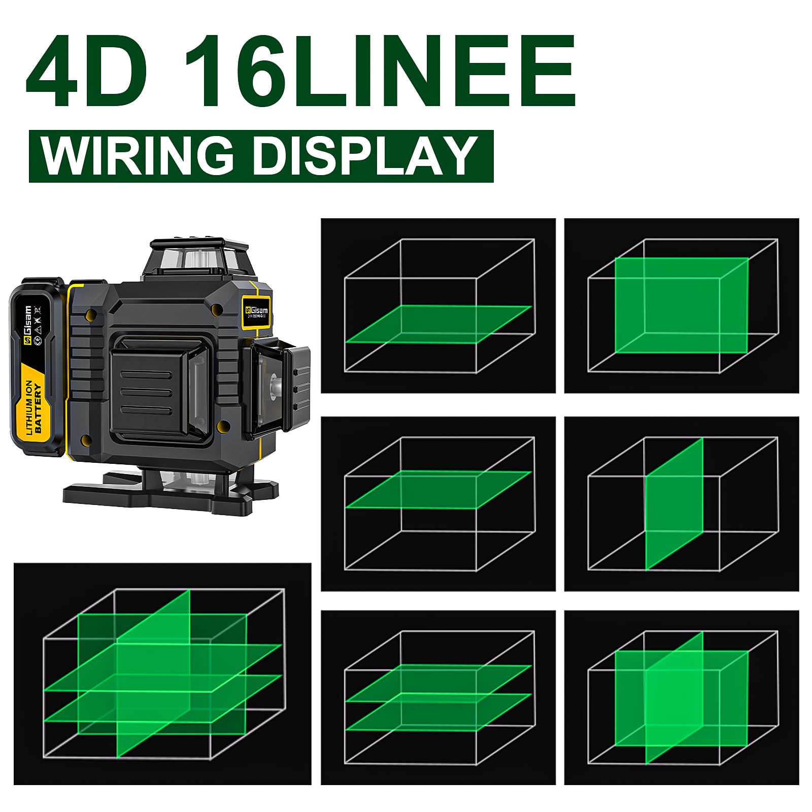 - Vollständige 360°-Abdeckung: Projiziert zwei horizontale und zwei vertikale 360°-Laserlinien, die den gesamten Raum abdecken. Die Linien können über separate Tasten einzeln oder kombiniert angesteuert werden, um maximale Flexibilität zu gewährleisten.