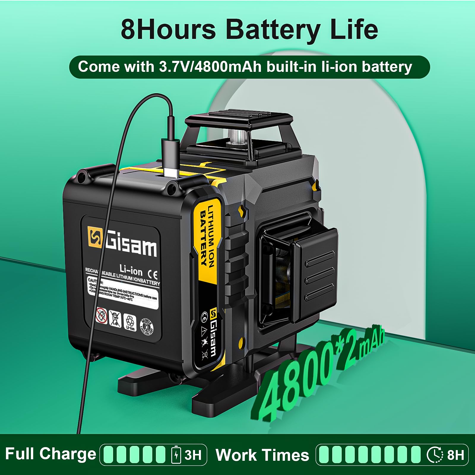 Das Gerät wird mit zwei leistungsstarken 4800-mAh-Akkus geliefert, die eine Betriebsdauer von bis zu 8 Stunden ermöglichen. Für unterbrechungsfreie Einsätze können Sie den Laser auch direkt über das mitgelieferte USB-C-Netzteil betreiben, selbst wenn die Akkus leer sind.