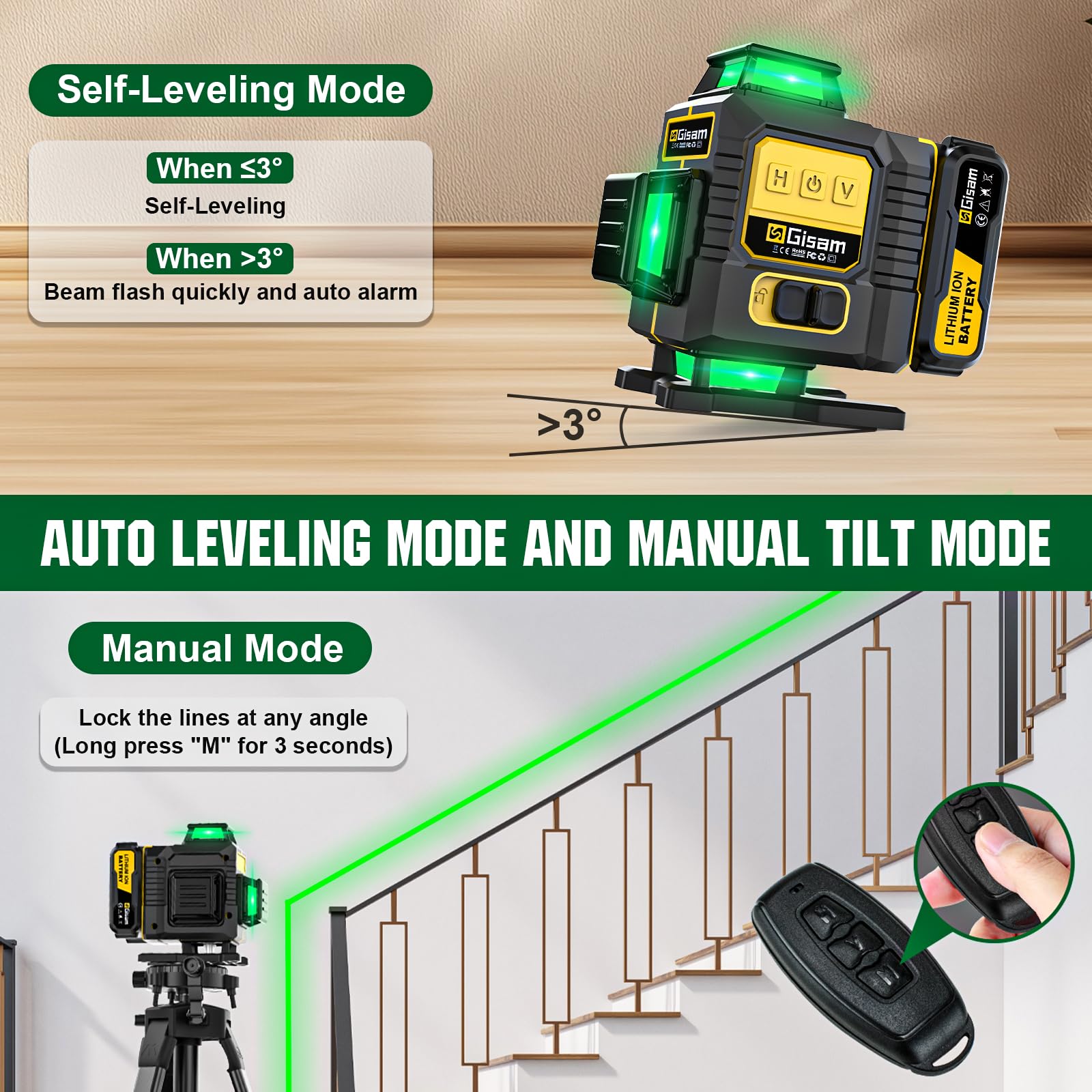 - Selbstnivellierung & Manueller Modus: Im selbstnivellierenden Modus richtet sich das Gerät bei Neigungen von bis zu 3° automatisch aus und warnt durch Blinken bei Überschreitung. Für individuelle Winkel kann das Pendel arretiert werden, um Linien in jeder gewünschten Schräge zu projizieren.