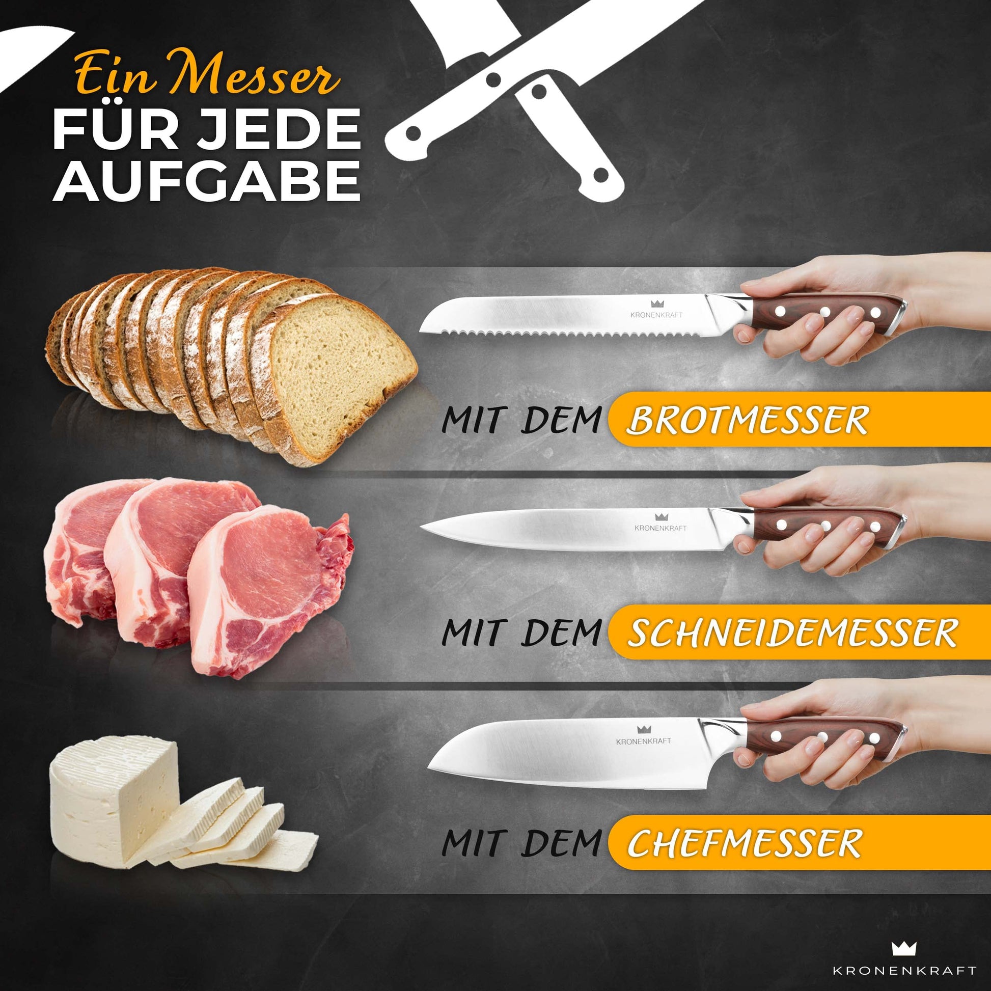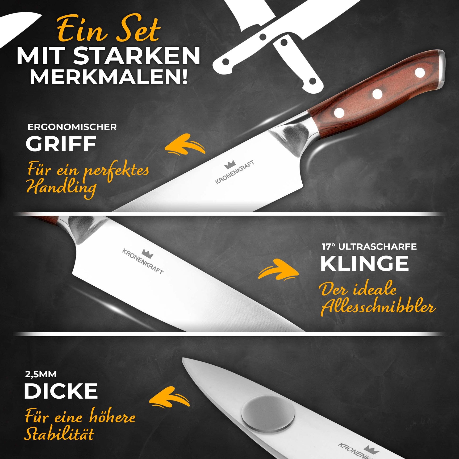 Das 9-teilige Messerset von KRONENKRAFT ist die Komplettlösung für ambitionierte Hobbyköche und alle, die Wert auf hochwertige Küchenwerkzeuge legen. Es vereint Funktionalität, Langlebigkeit und ein edles Design in einem Paket.