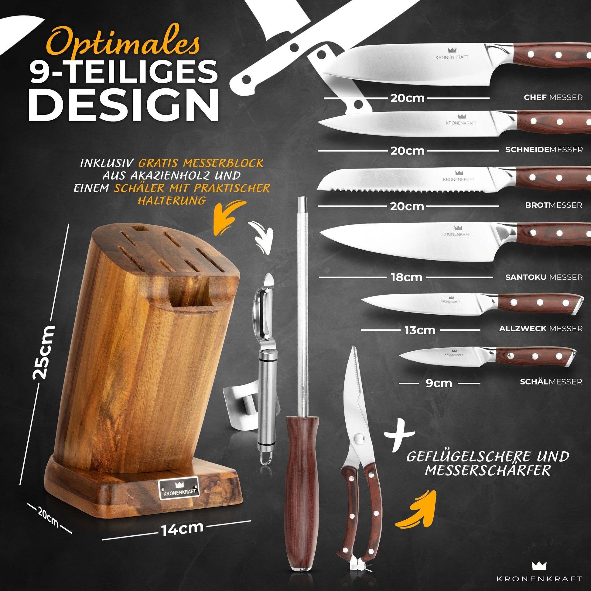 KRONENKRAFT® Messerset 9-tlg. mit Block – Pakkaholzgriffe