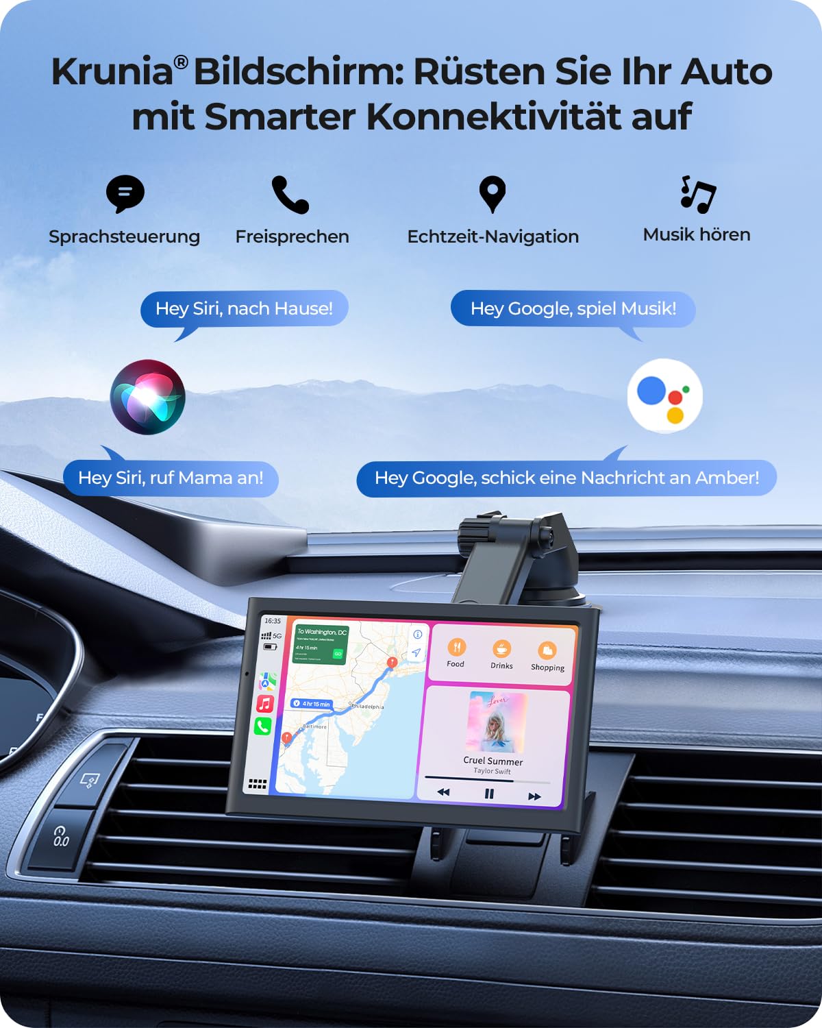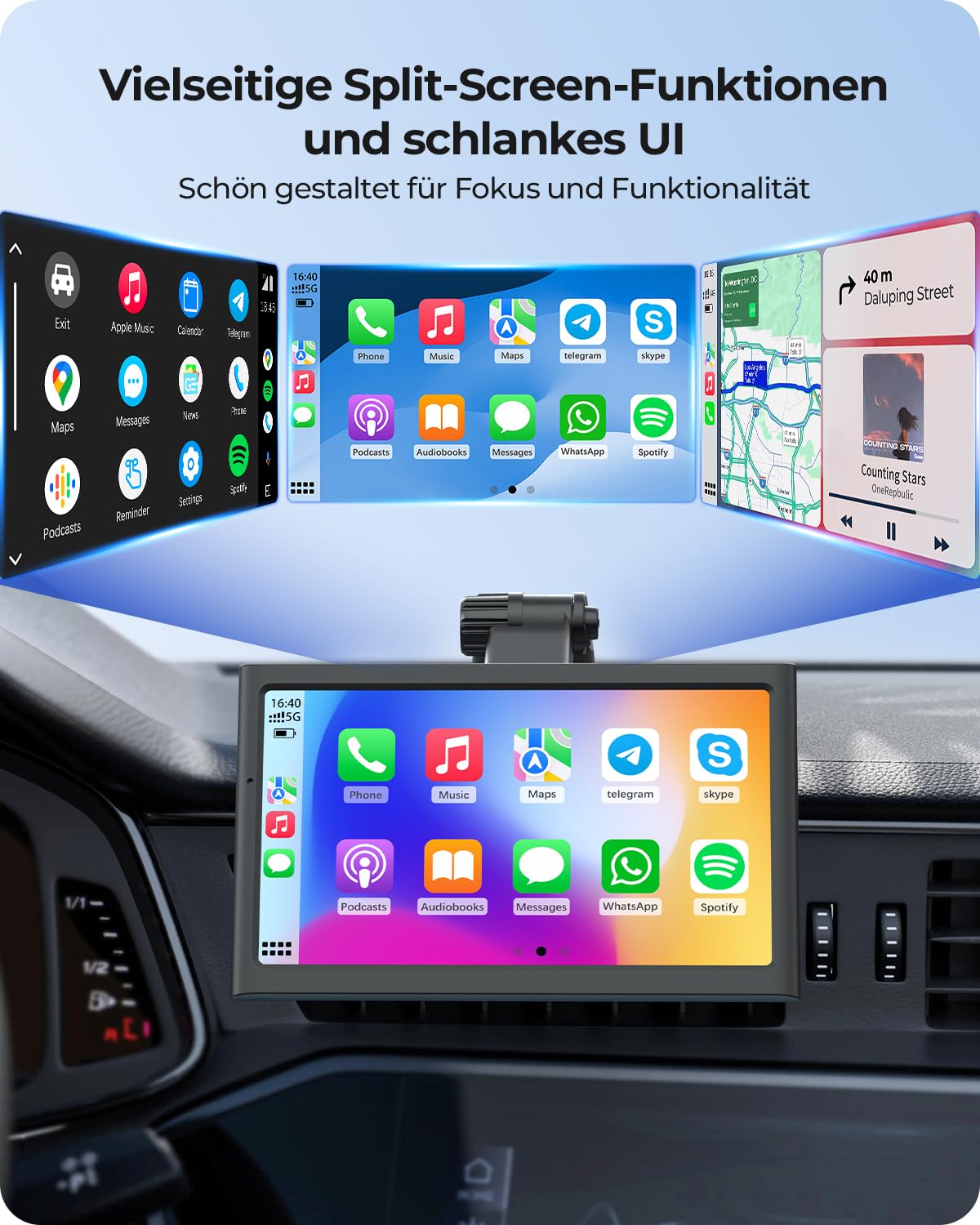 Werten Sie Ihr Fahrerlebnis mit diesem portablen 7-Zoll-Display auf, das moderne Smartphone-Funktionalität nahtlos und kabellos in jedes Fahrzeug integriert.