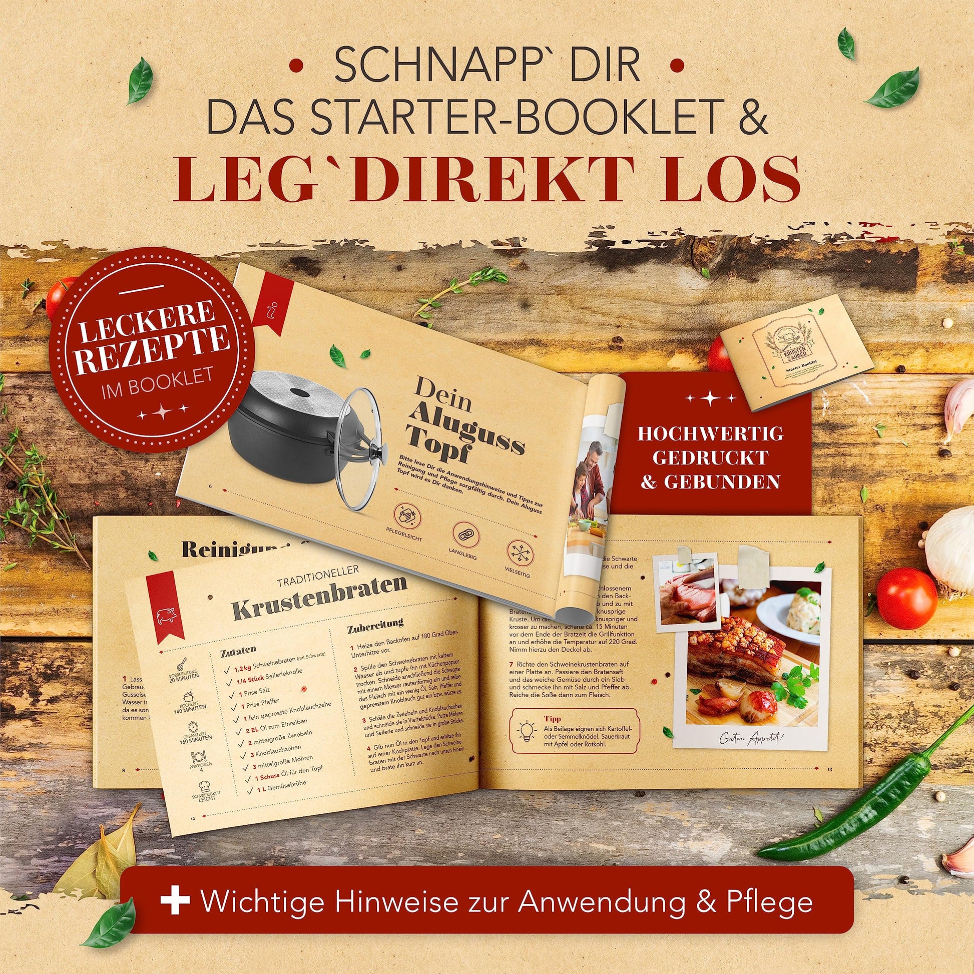 Das umfassende Set beinhaltet den 6-Liter-Aluguss-Bräter mit 28 cm Durchmesser, einen leichten Aluminium-Deckel zum scharfen Anbraten und für den Backofen sowie einen praktischen Glasdeckel zum energiesparenden Sichtkochen auf dem Herd. Zusätzlich erhalten Sie Rezeptvorschläge.