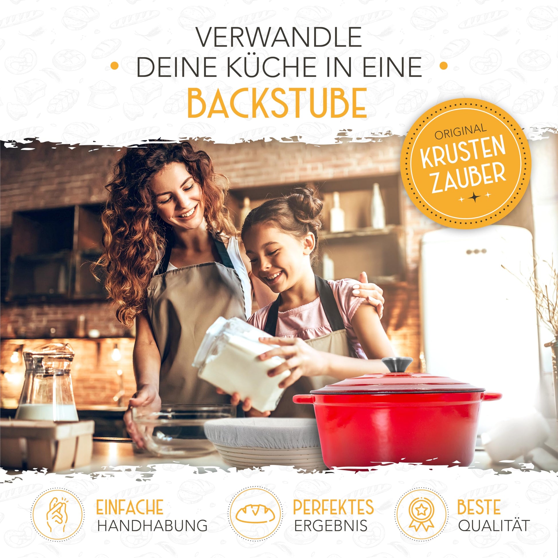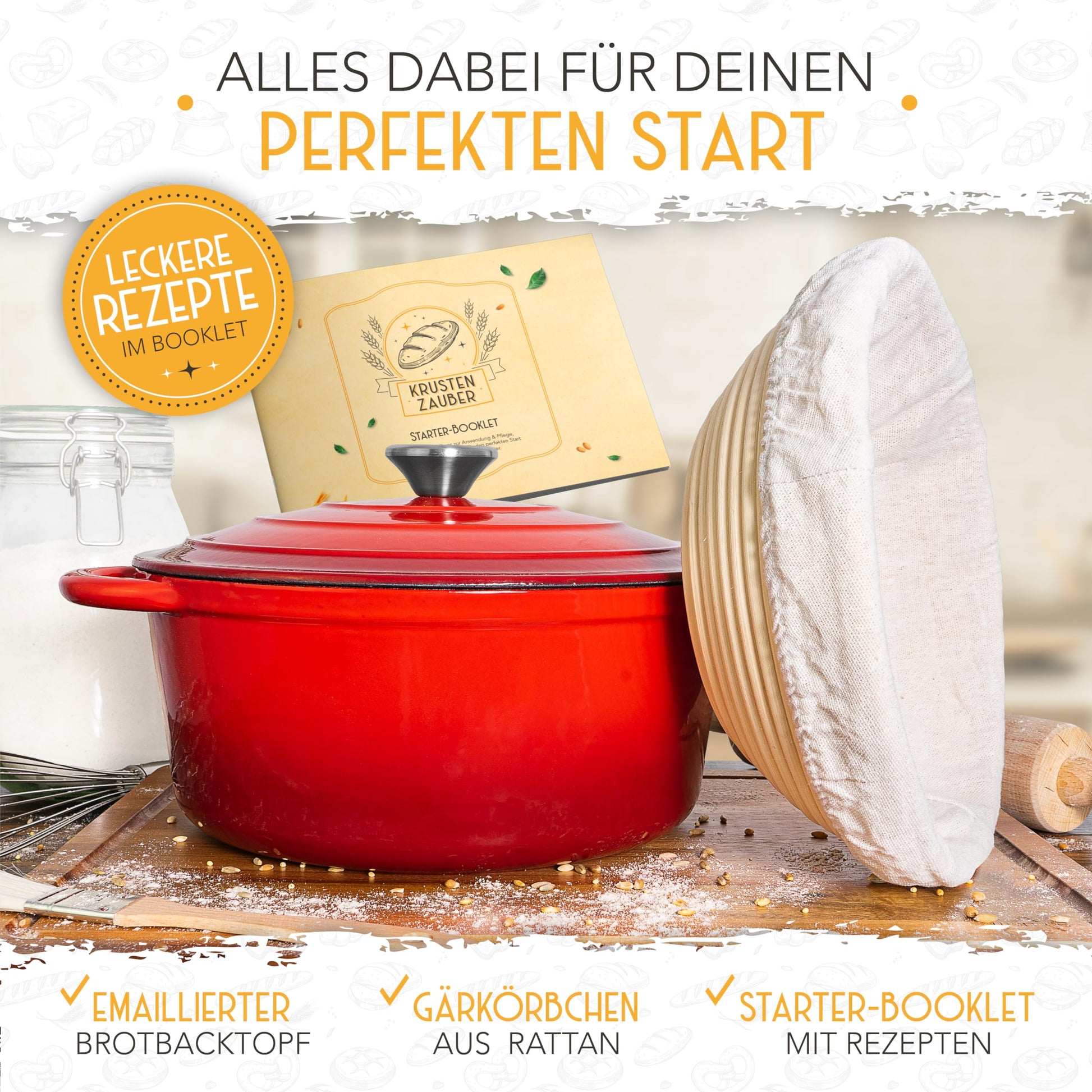 Das Set beinhaltet alles, was Sie für den Start benötigen: einen emaillierten Gusseisen-Topf (26 cm Durchmesser) mit passendem Deckel, einen traditionellen Gärkorb aus Rattan für die perfekte Brotform und einen bewährten Rezeptvorschlag.