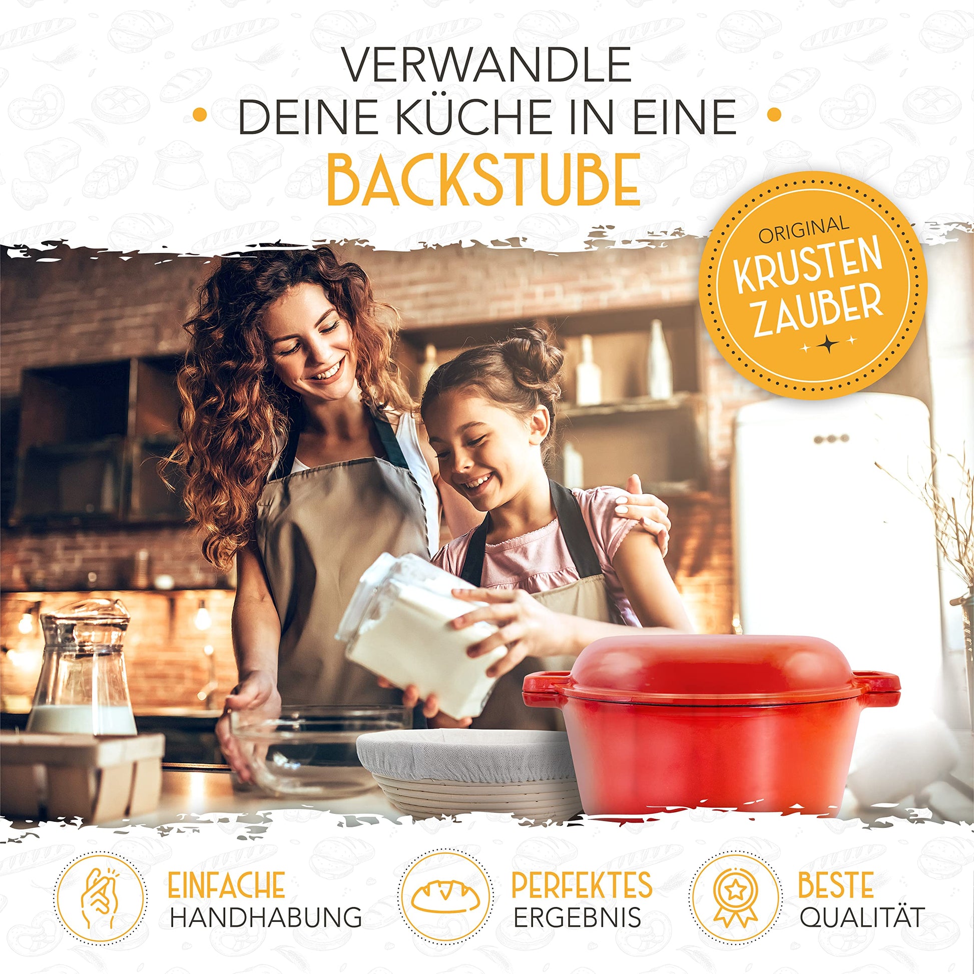 Verwandeln Sie Ihre Küche in eine duftende Backstube. Der schwere Gusseisen-Topf sorgt durch seine exzellente und gleichmässige Hitzeverteilung für eine herrlich knusprige Kruste, während das Brot im Innern saftig und luftig bleibt. Der mitgelieferte Gärkorb verleiht Ihrem Brot nicht nur die klassische Form, sondern auch das traditionelle Ringmuster, genau wie vom Profi-Bäcker.