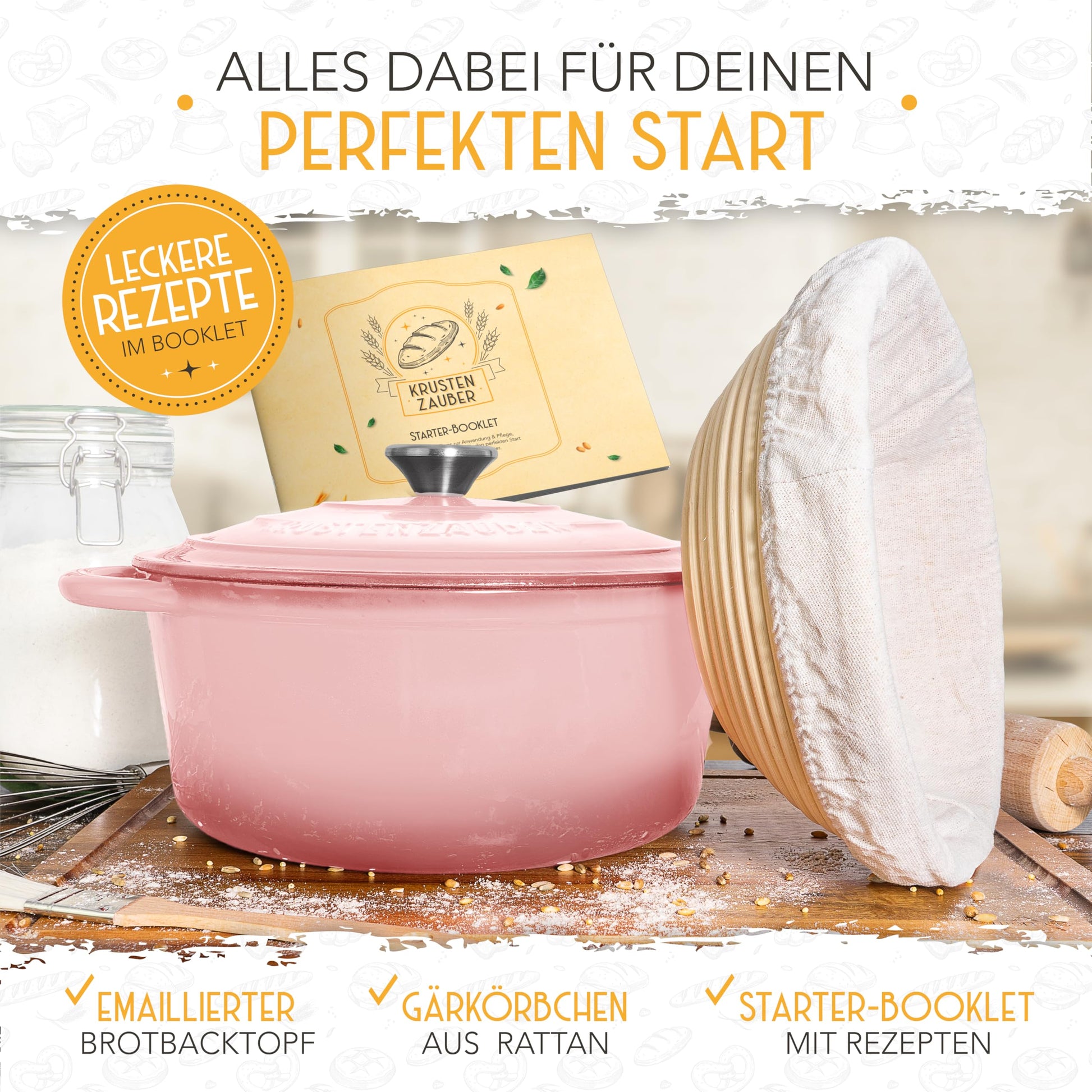 Das Komplettset beinhaltet einen hochwertigen, emaillierten Gusseisentopf mit 26 cm Durchmesser, einen traditionellen Gärkorb aus Rattan für die perfekte Brotform und einen bewährten Rezeptvorschlag, damit Sie sofort loslegen können.