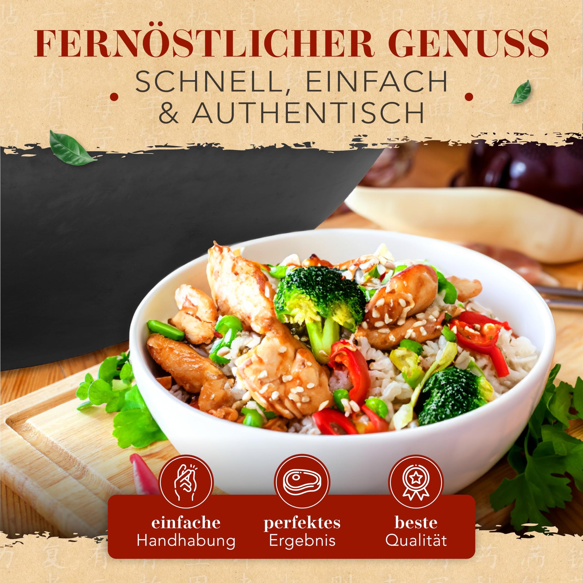 - Traditionelle Handwerkskunst: Handgehämmerte Stahlwokpfanne für authentische chinesische Gerichte, von Stir-Fry über Woknudeln bis zu knackigem Gemüse.
