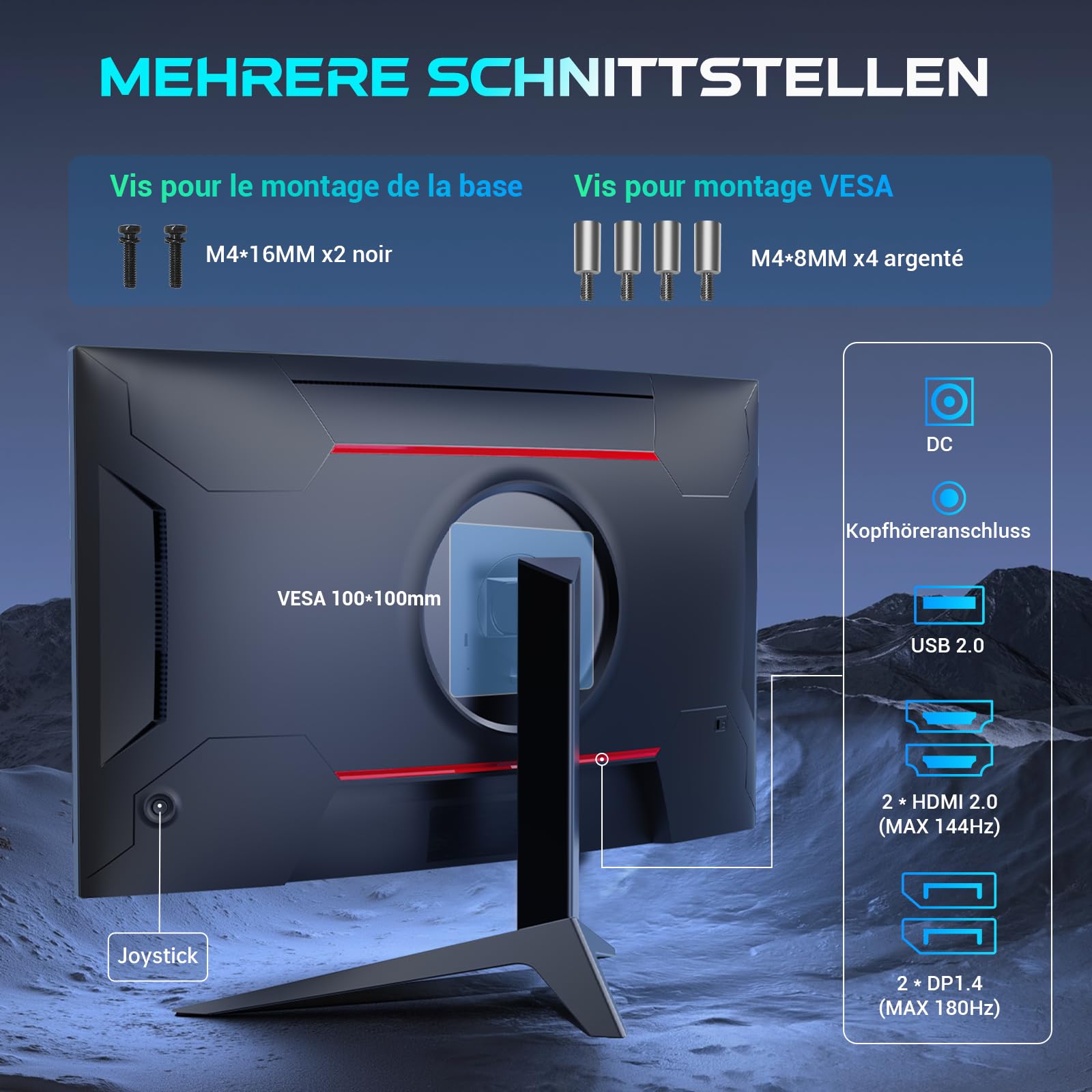 Der Monitor erreicht seine maximale Bildwiederholrate von 180 Hz bei QHD-Auflösung über den DisplayPort-Anschluss. Bei Verwendung des HDMI-Anschlusses unterstützt er eine Bildwiederholrate von bis zu 144 Hz, was ihn auch ideal für Konsolen wie die PS5 oder Xbox Series X macht.