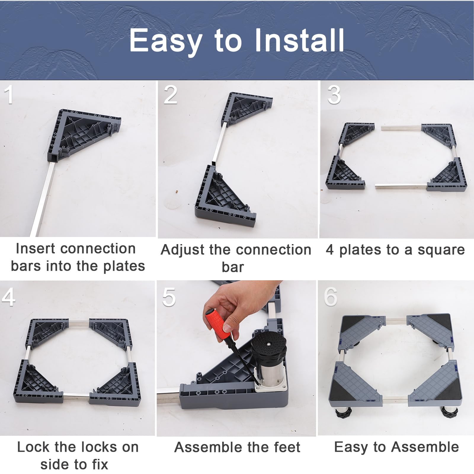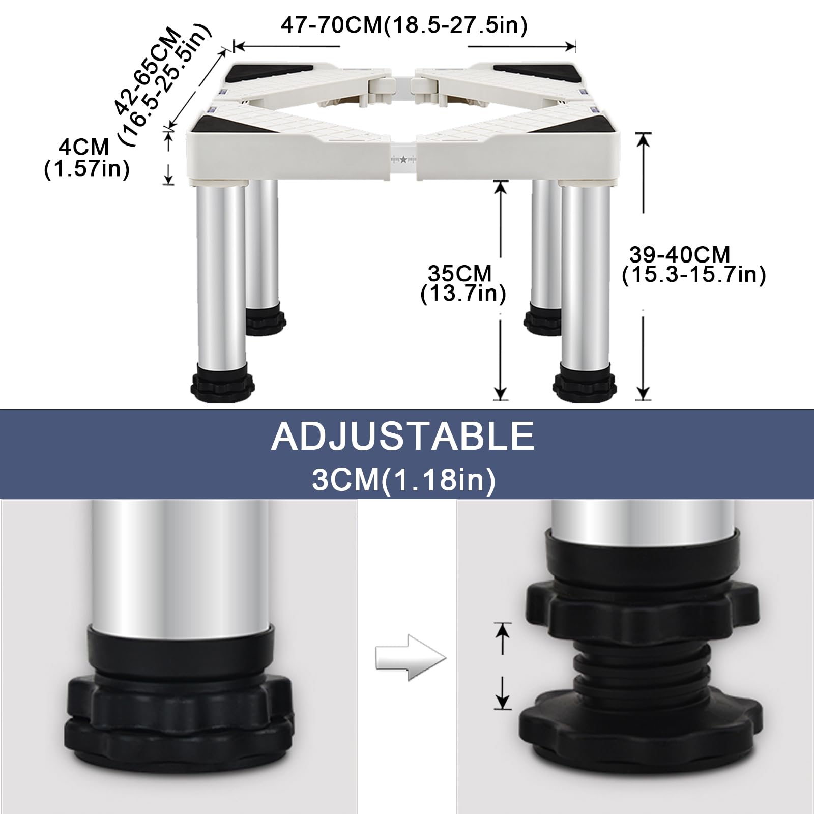 Messen Sie vor dem Kauf unbedingt die Bodenmasse Ihres Geräts, um sicherzustellen, dass Länge und Breite zwischen 47 cm und 70 cm liegen. Die Montage ist einfach konzipiert und der Sockel lässt sich schnell und präzise auf die benötigte Grösse einstellen.