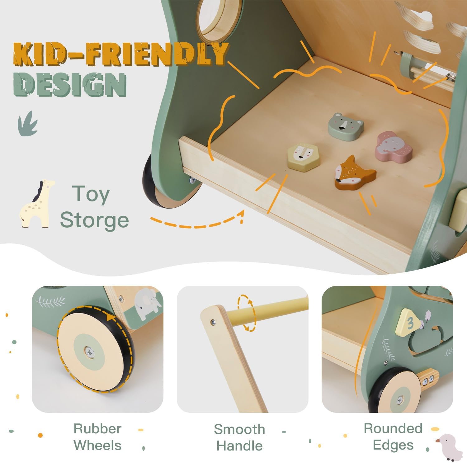 Ja, absolut. Der Wagen ist aus robustem Massivholz und MDF gefertigt und erfüllt strenge europäische (EN71 CE) und amerikanische (ASTM/CE) Sicherheitsnormen. Alle Kanten sind abgerundet, um Verletzungen zu vermeiden. Die gummierten Räder schützen Ihre Böden vor Kratzern und sorgen für ein leises Rollen.