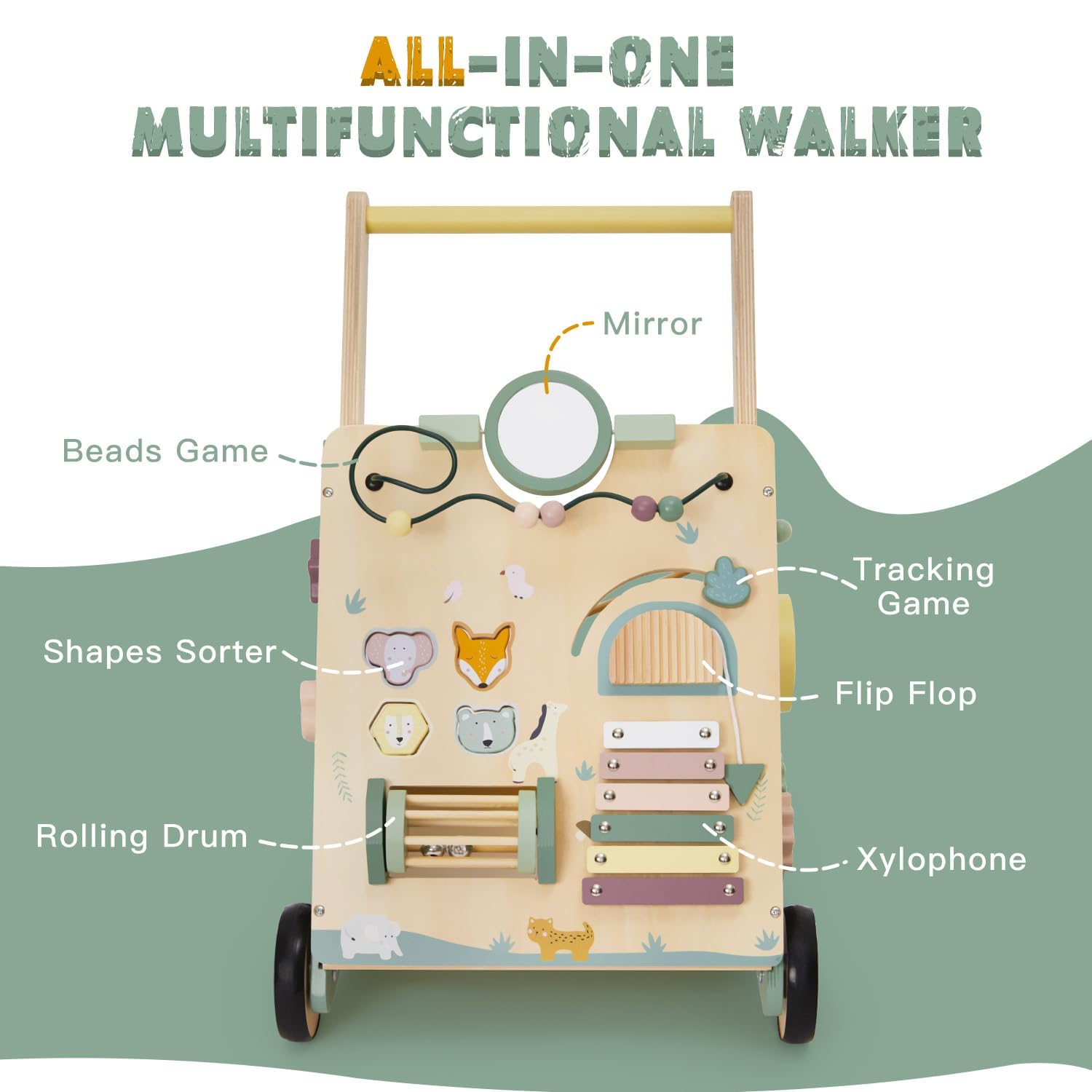 Der Wagen ist ein 8-in-1 Aktivitätszentrum, das speziell zur Förderung der Sinne und motorischen Fähigkeiten entwickelt wurde. Er enthält ein Xylophon, eine Drehtrommel, einen Spiegel, ein Perlenlabyrinth, drehbare Zahnräder und einen Formensortierer.