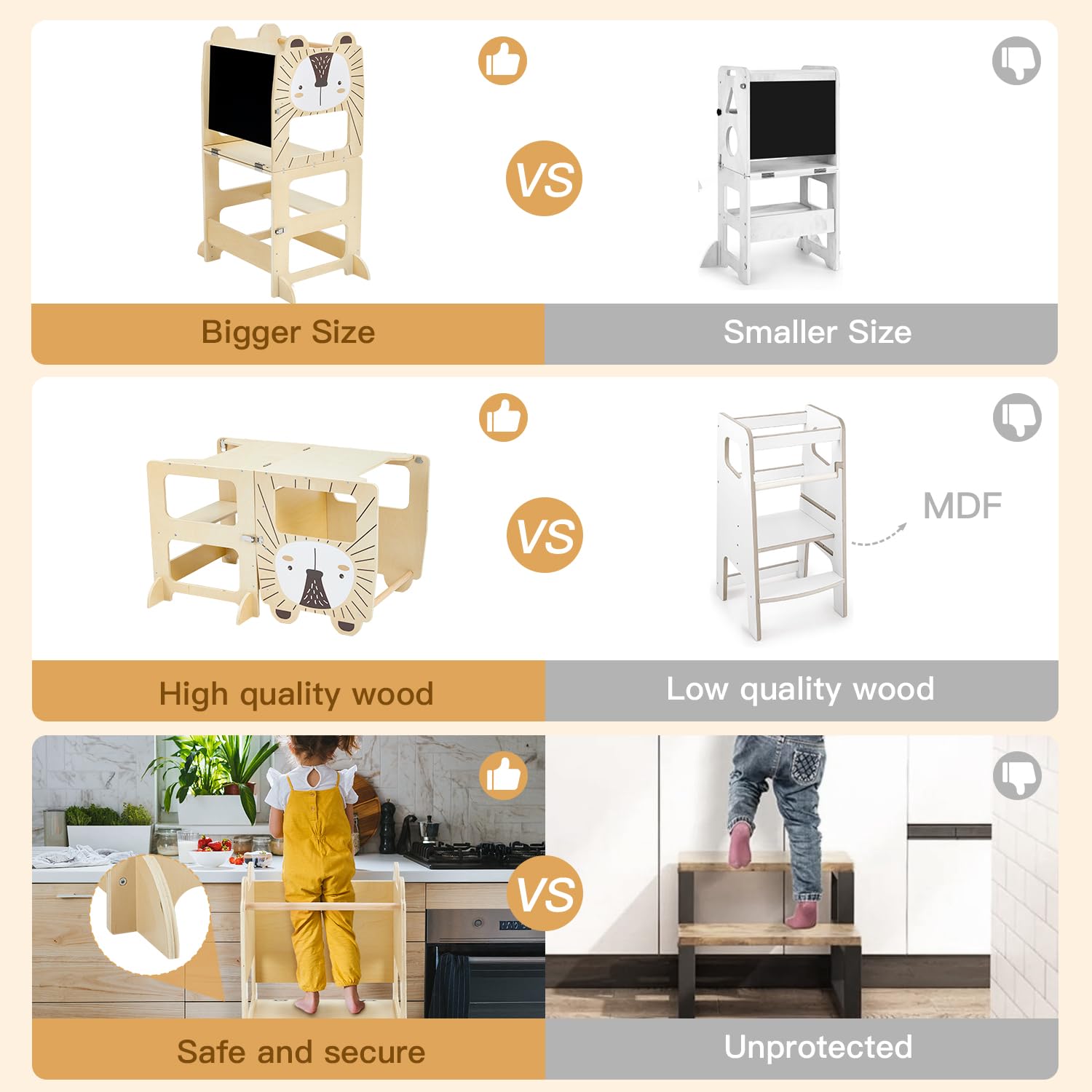 Die clever umwandelbare Bauweise sorgt für langanhaltenden Spass und Nutzen. Ob als sicherer Turm zum Mithelfen, als gemütlicher Maltisch oder als kreative Kreidetafel – dieses Möbelstück passt sich den Bedürfnissen und dem Wachstum Ihres Kindes an und spart wertvollen Platz im Kinderzimmer.