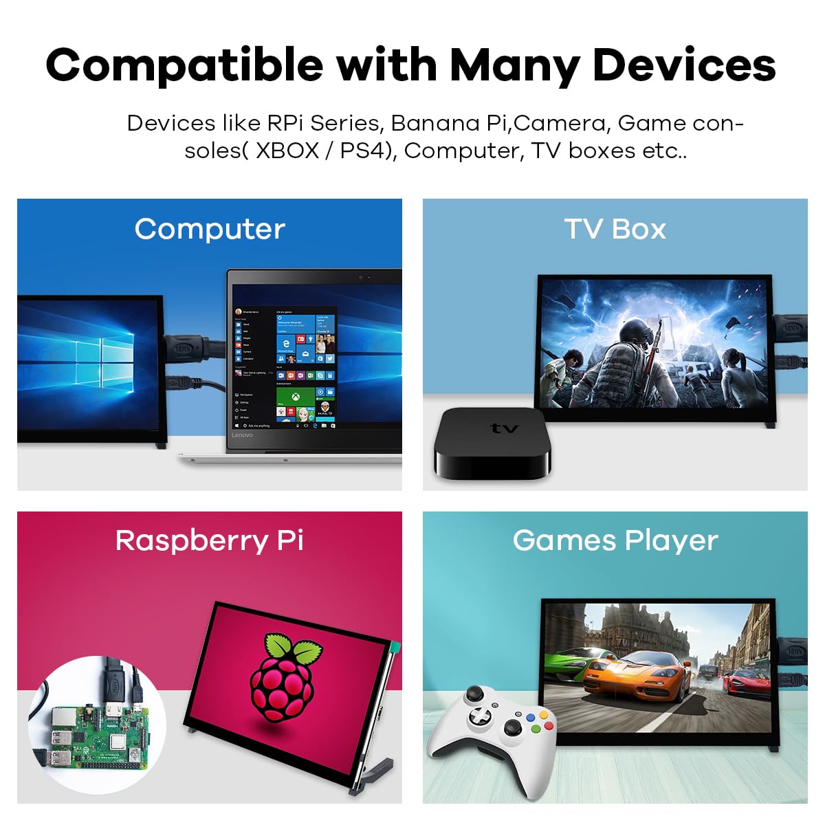 Der Monitor ist extrem flexibel und unterstützt eine Vielzahl von Geräten, darunter populäre Entwickler-Boards wie Raspberry Pi (alle Versionen), Jetson Nano, Banana Pi und BB Black. Zudem ist er auch als externer Monitor für PCs mit Windows 10, 8 oder 7 einsetzbar.