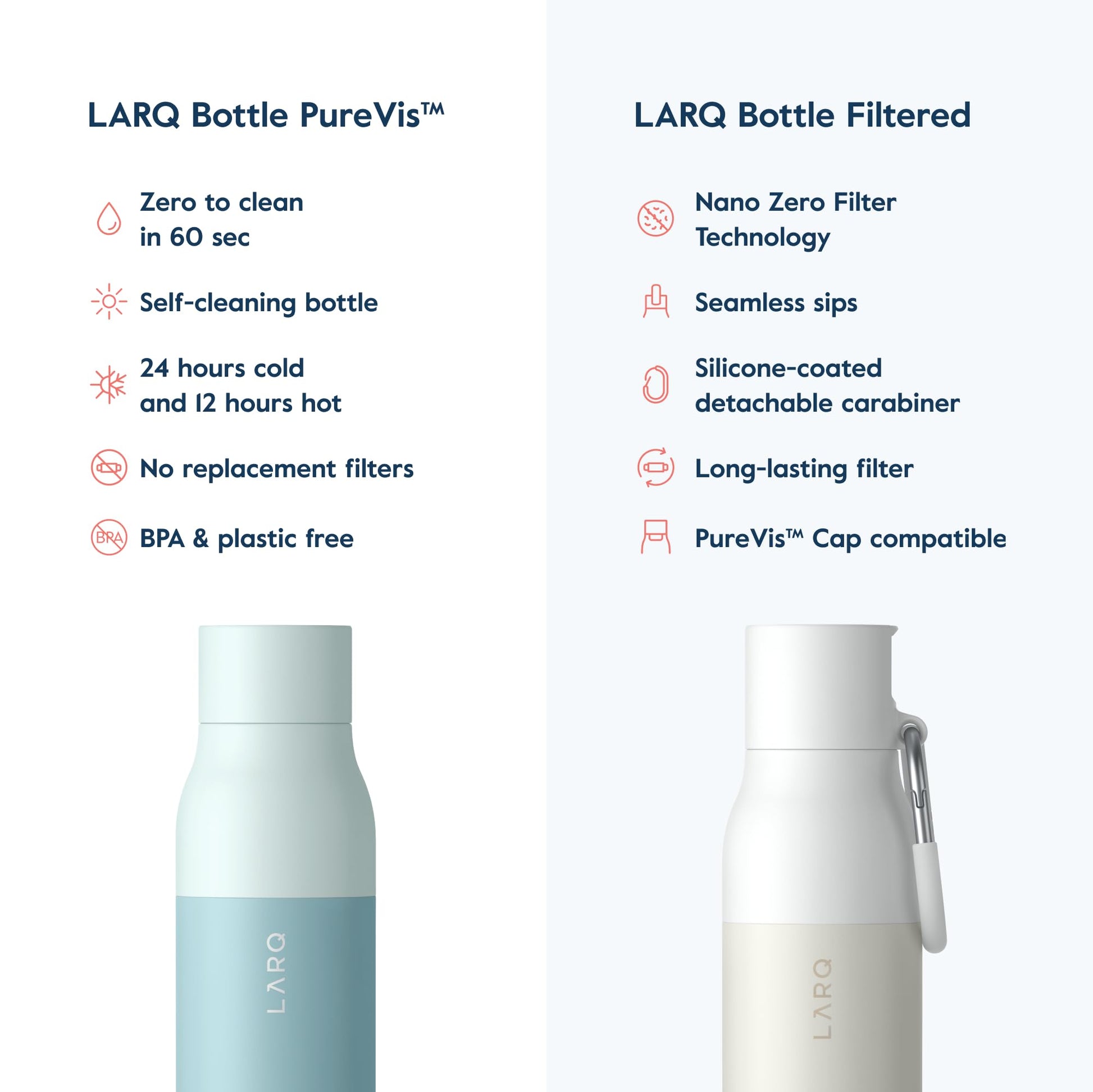 Dank der doppelwandigen Vakuumisolierung aus hochwertigem Edelstahl hält die LARQ Bottle PureVis Getränke bis zu 24 Stunden lang eiskalt oder bis zu 12 Stunden lang heiss, was sie zum perfekten Begleiter für Alltag, Sport und Reisen macht.