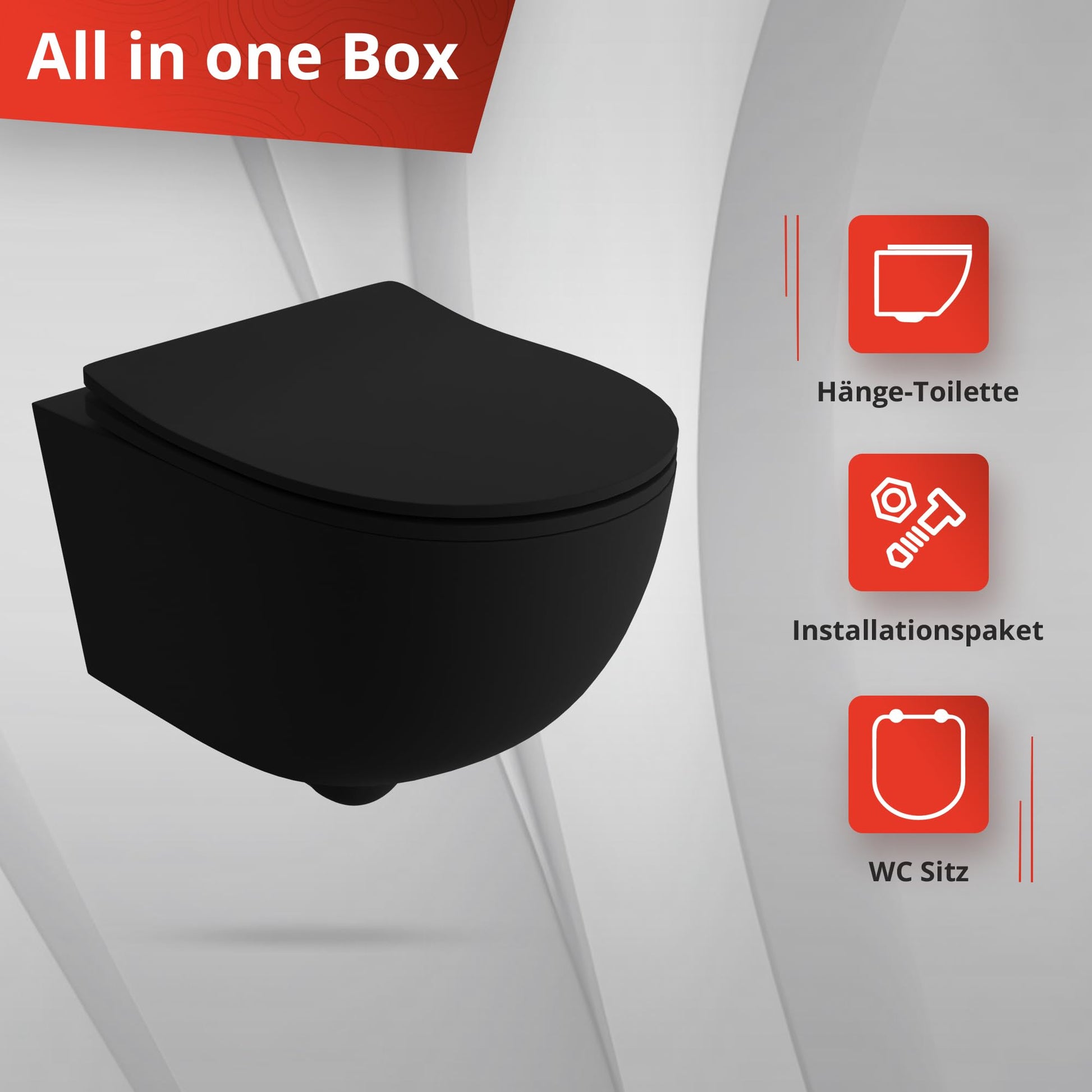 Das Hänge-WC hat die kompakten Masse von 360 mm (Breite) x 480 mm (Tiefe) x 375 mm (Höhe). Im Lieferumfang enthalten sind das spülrandlose WC-Becken aus Sanitärkeramik in Mattschwarz sowie der passende Duroplast WC-Sitz mit Absenkautomatik, Quick-Release-Funktion und hochwertigen Metallscharnieren.