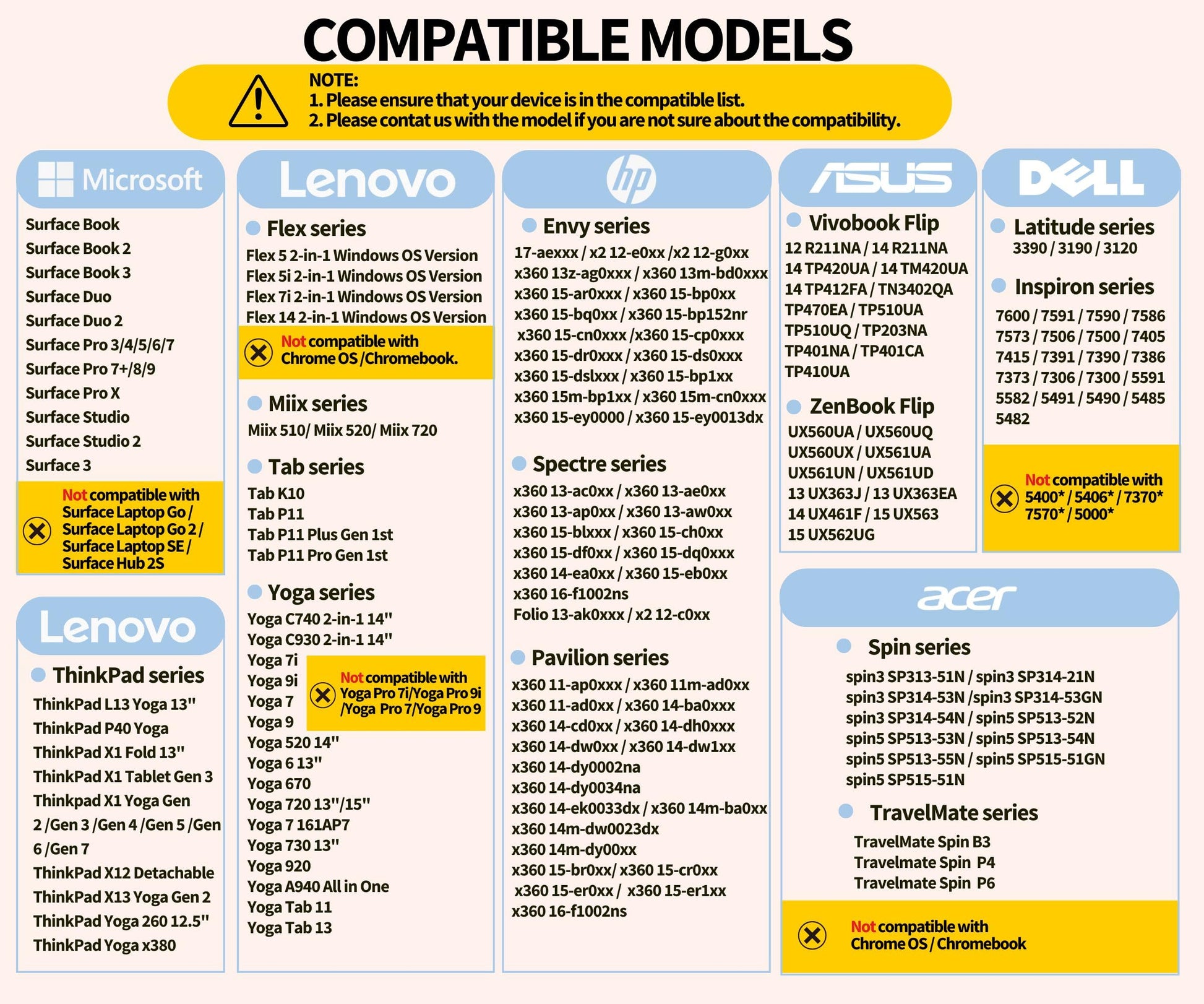 - Wichtiger Kompatibilitätshinweis: Dieser Stift ist nicht mit Chromebook OS, Apple- oder Samsung-Geräten kompatibel. Bitte überprüfen Sie vor dem Kauf unbedingt die Liste der kompatiblen Modelle.