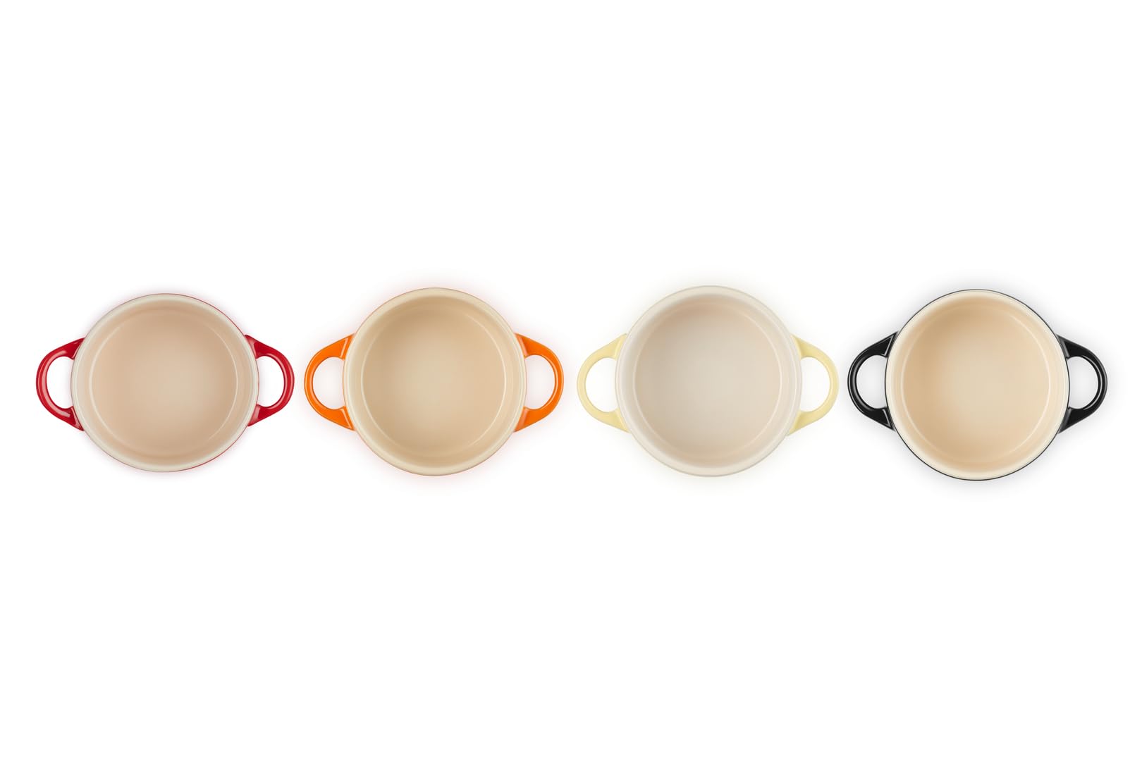 - Set bestehend aus vier Mini-Cocottes in den Farben Gelb, Kirschrot, Ofenrot und Schwarz