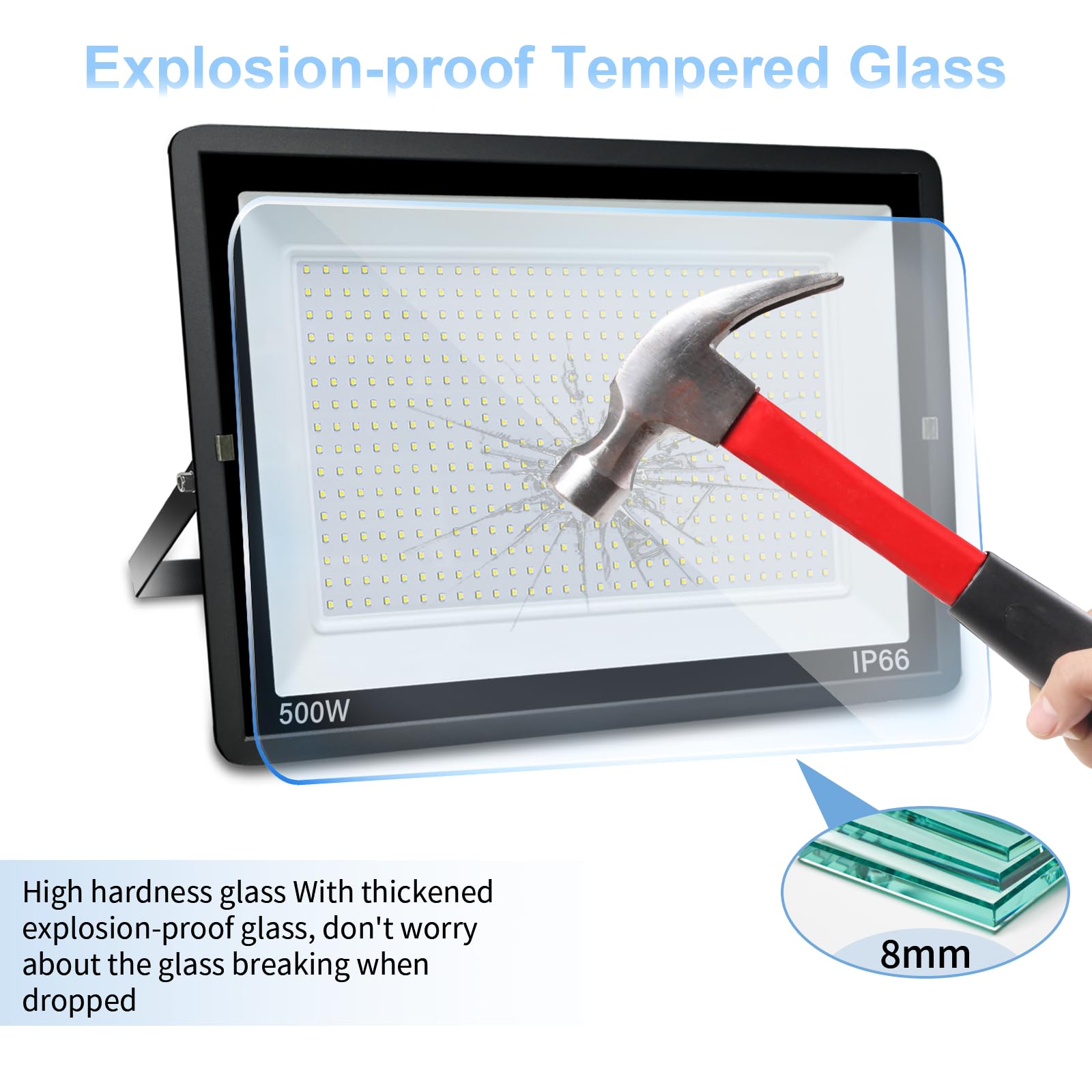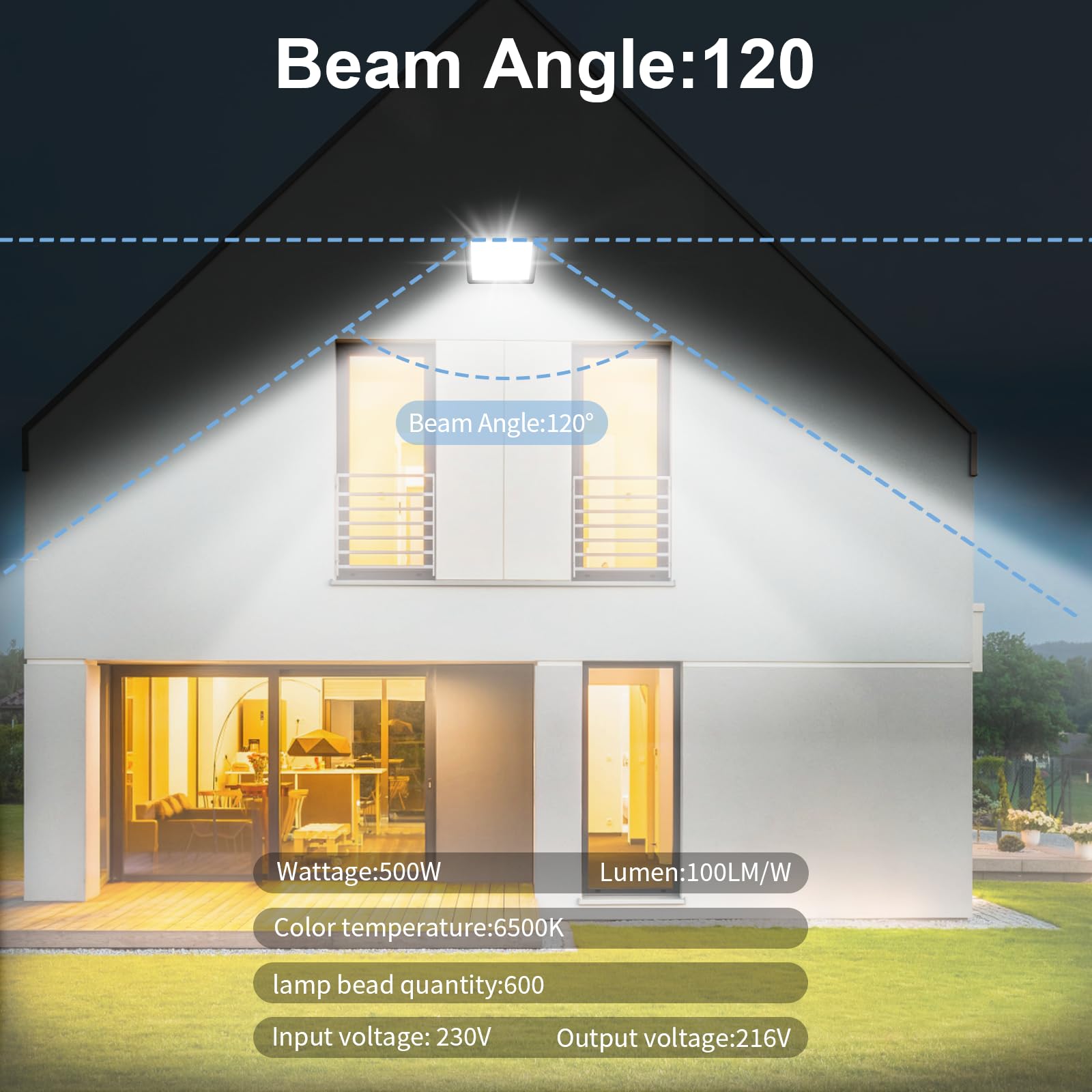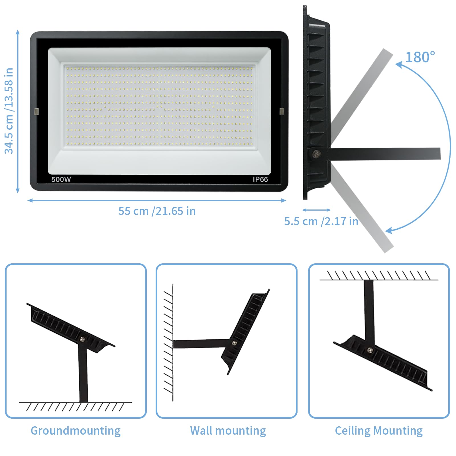 Mit einer extremen Helligkeit von 50'000 Lumen und einem breiten 120-Grad-Abstrahlwinkel sorgt dieser 500W-Strahler für eine grossflächige und gleichmässige Ausleuchtung. Er eignet sich perfekt für grosse Bereiche wie Sportplätze, Innenhöfe, Parkplätze oder Fassaden.