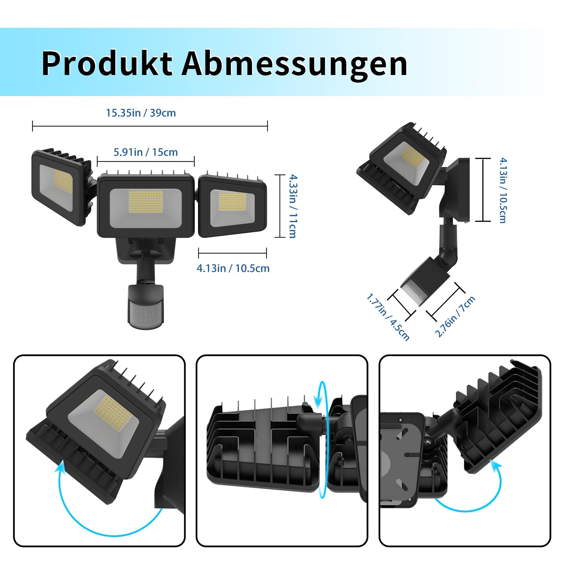 Passen Sie die Beleuchtung exakt an Ihre Bedürfnisse an. Der intelligente Sensor aktiviert das Licht nur bei Dunkelheit und registrierter Bewegung, was die Effizienz zusätzlich steigert. Bei kontinuierlicher Aktivität im Erfassungsbereich verlängert sich die Leuchtdauer automatisch, sodass Sie nie unerwartet im Dunkeln stehen. Richten Sie die drei flexiblen Leuchtköpfe präzise dorthin, wo Sie das Licht benötigen, und leuchten Sie grosse Bereiche wie Einfahrten oder Grundstücksgrenzen optimal aus.