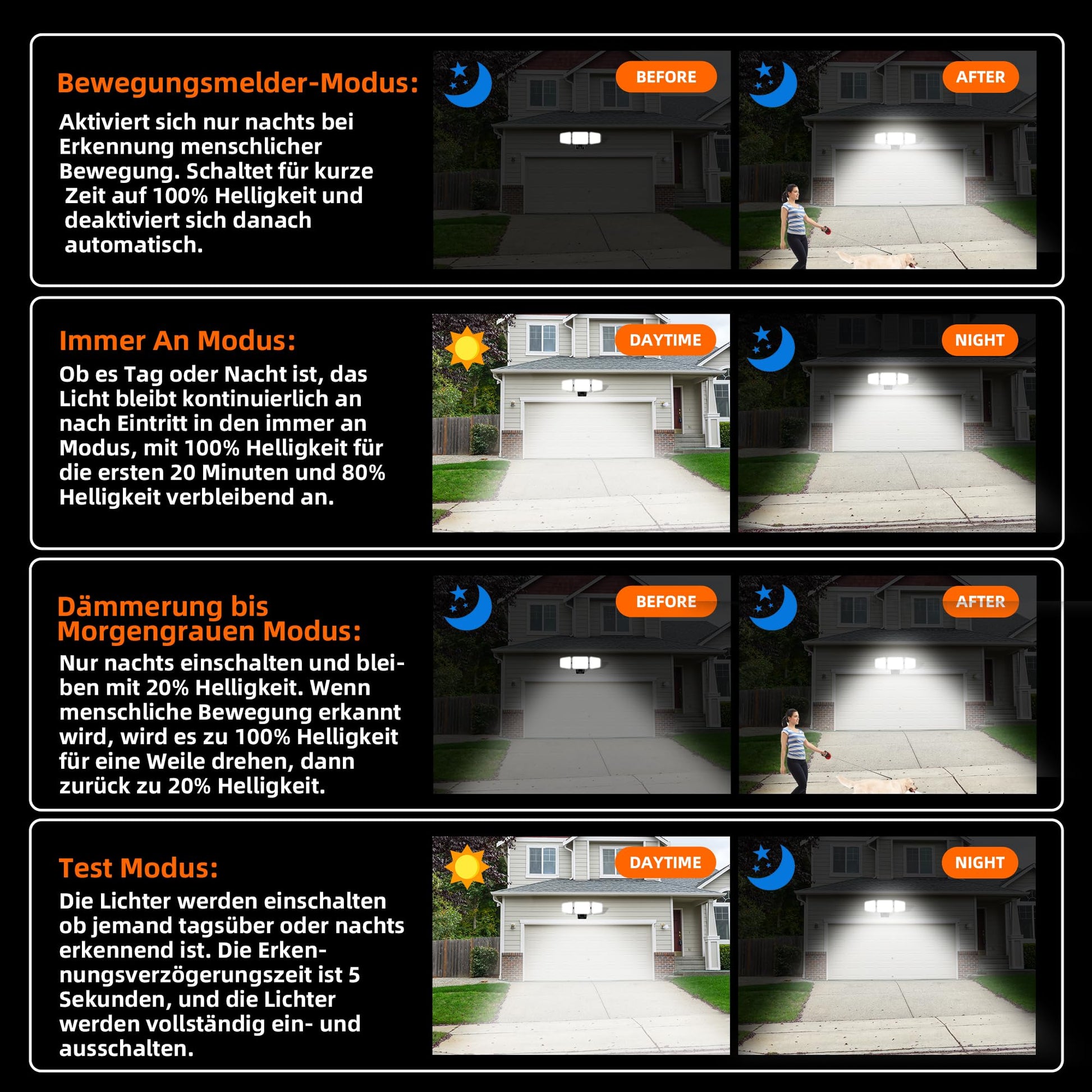 Die Leuchte bietet vier intelligente Modi zur Auswahl: 1. Dauerlicht für konstante Beleuchtung, 2. Dämmerungsautomatik (automatisch an/aus von Dämmerung bis Morgengrauen), 3. reine Bewegungserkennung (6-12 m Reichweite) und 4. ein benutzerdefinierter Timer. So können Sie die Funktion perfekt an Ihre Bedürfnisse anpassen.