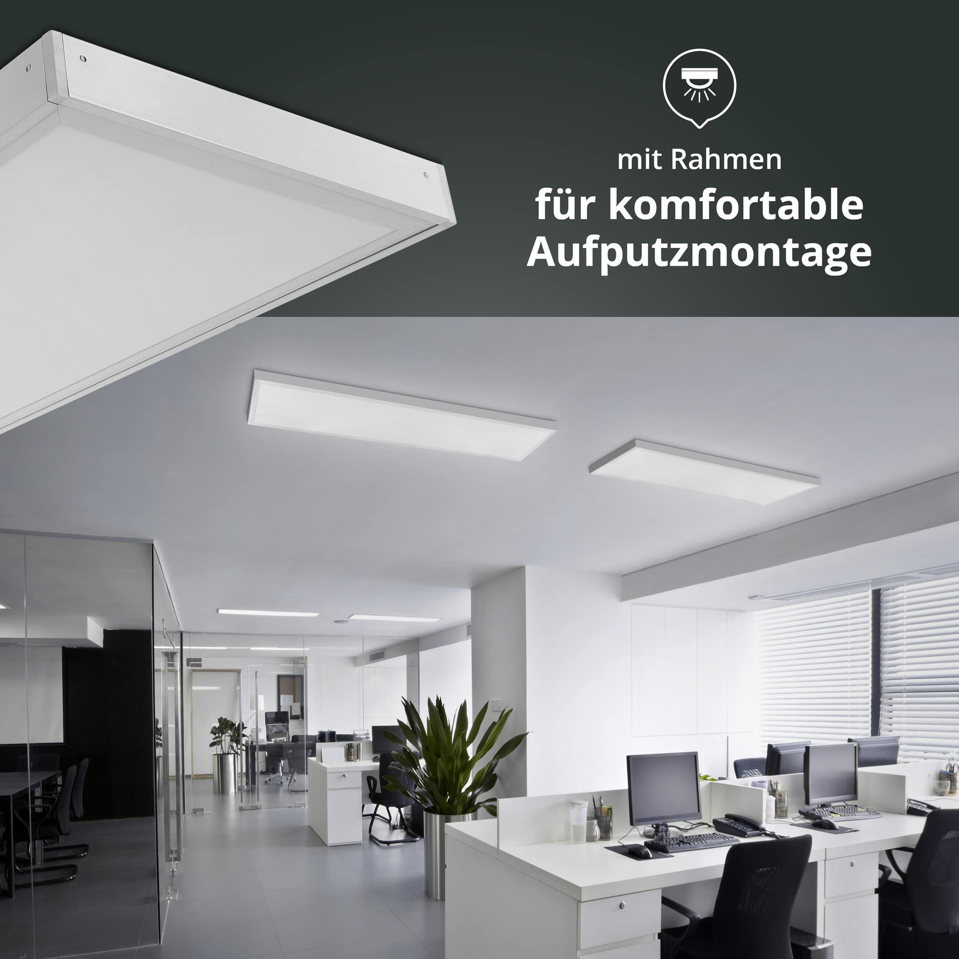 - Einfache Aufputzmontage: Der mitgelieferte Aufbaurahmen ermöglicht eine unkomplizierte Montage an Decke oder Wand. Das Netzteil findet dabei unsichtbar im Rahmen Platz.