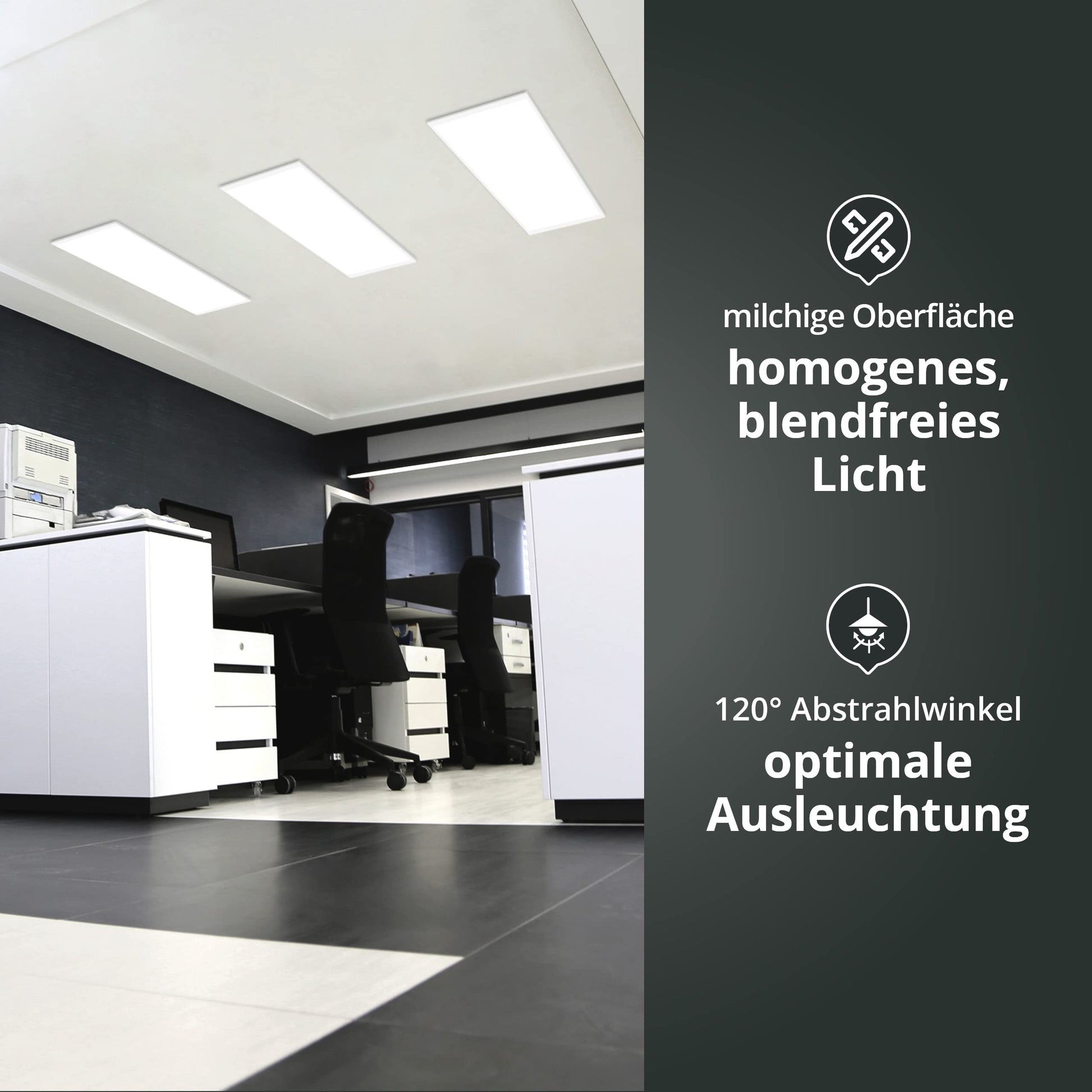 Dieses Panel ist mit einem Blendwert von UGR<19 speziell für Bildschirmarbeitsplätze optimiert und erfüllt die Norm DIN EN12464-1. Das tageslichtweisse (6000K), flimmerfreie Licht schont die Augen, beugt Ermüdung vor und fördert die Konzentration, was es perfekt für Büros, Schulen und andere Arbeitsumgebungen macht.