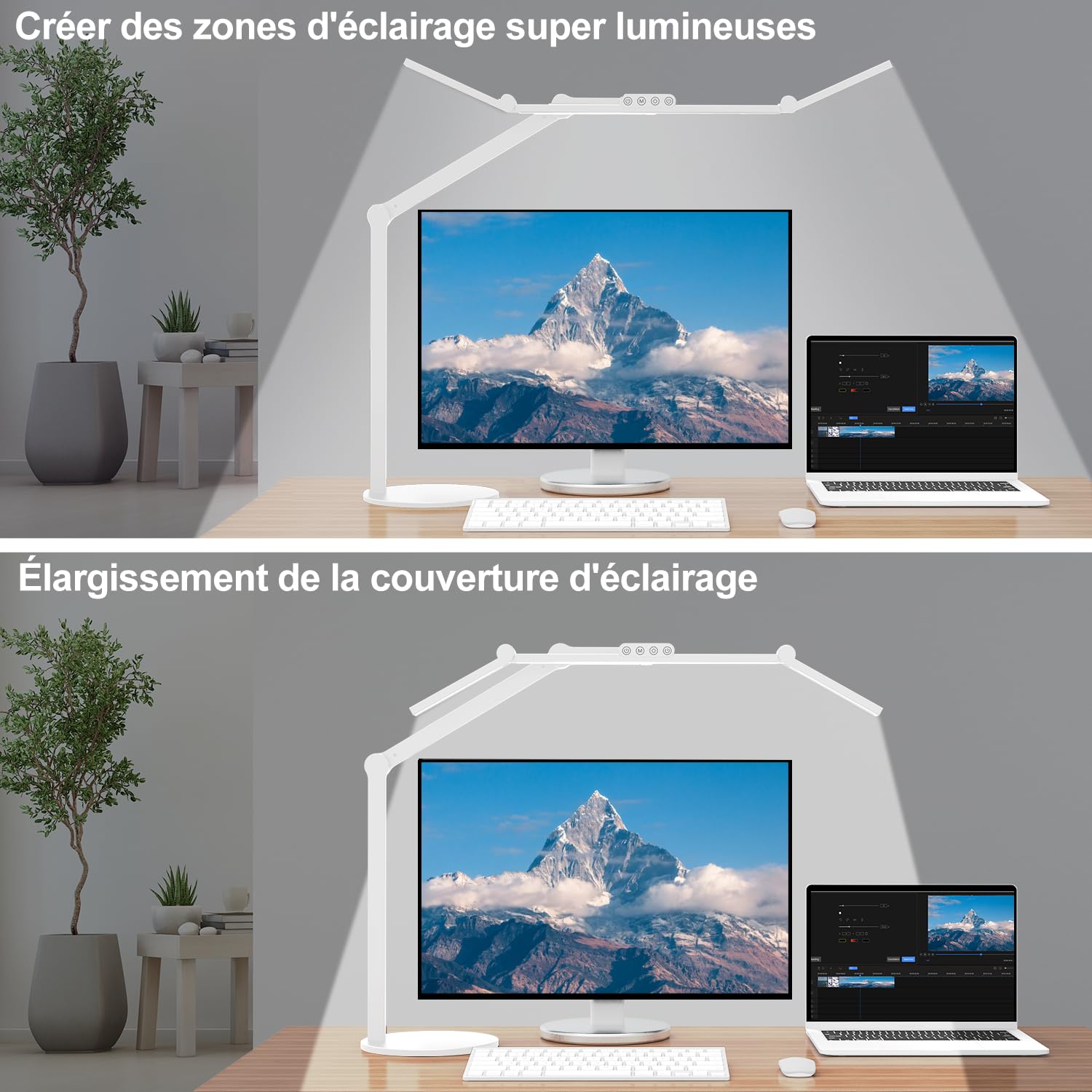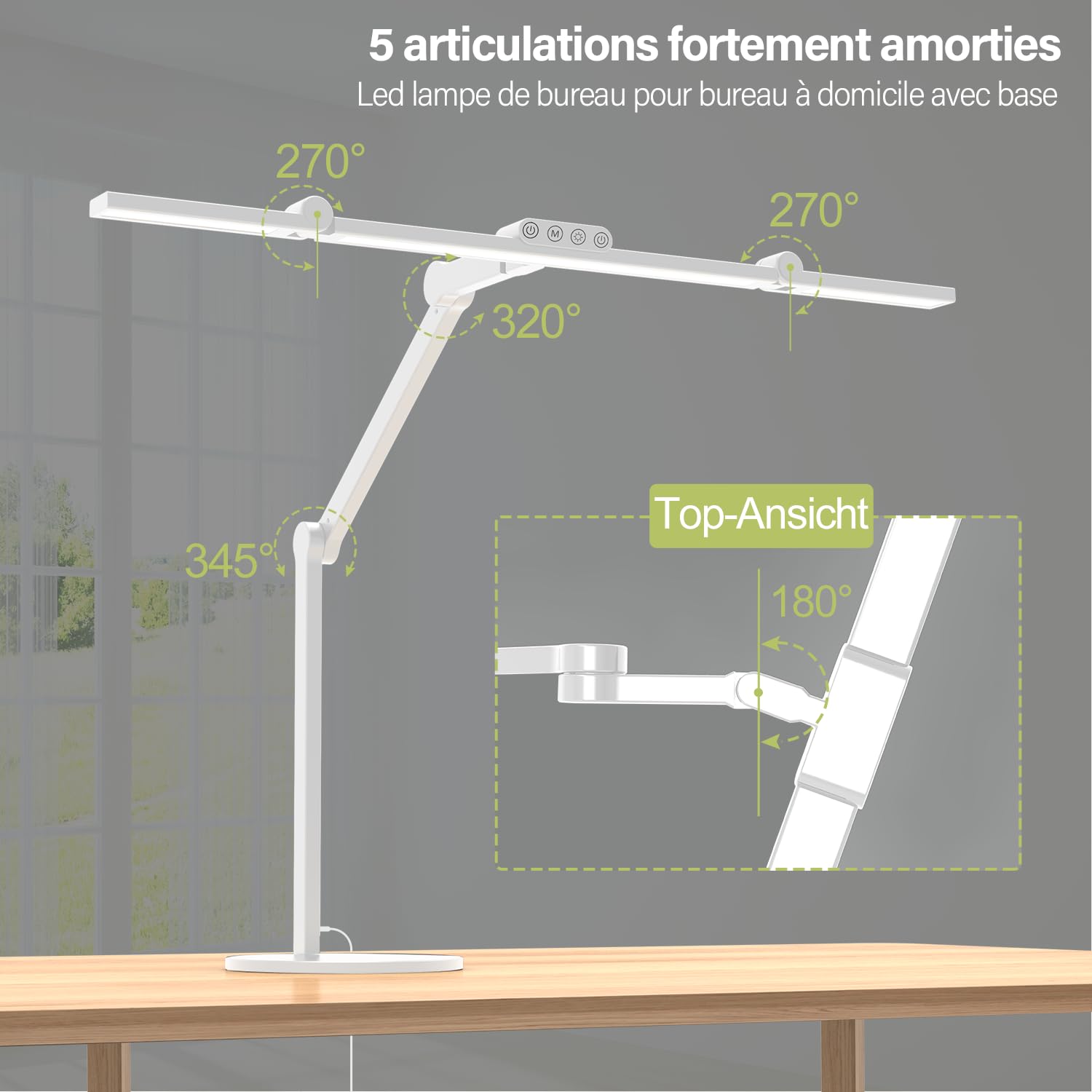 Maximale Anpassungsfähigkeit für Ihren Arbeitsplatz: Dank der fünf beweglichen Gelenke und der verstellbaren Höhe richten Sie das Licht genau dorthin, wo Sie es benötigen. Die beiden seitlichen Leuchten können nach unten für eine konzentrierte Ausleuchtung oder nach oben für ein weiches, indirektes Umgebungslicht geschwenkt werden. So passt sich die Lampe mühelos jeder Aufgabe und jedem Schreibtisch-Setup an, selbst zwischen zwei Monitoren.