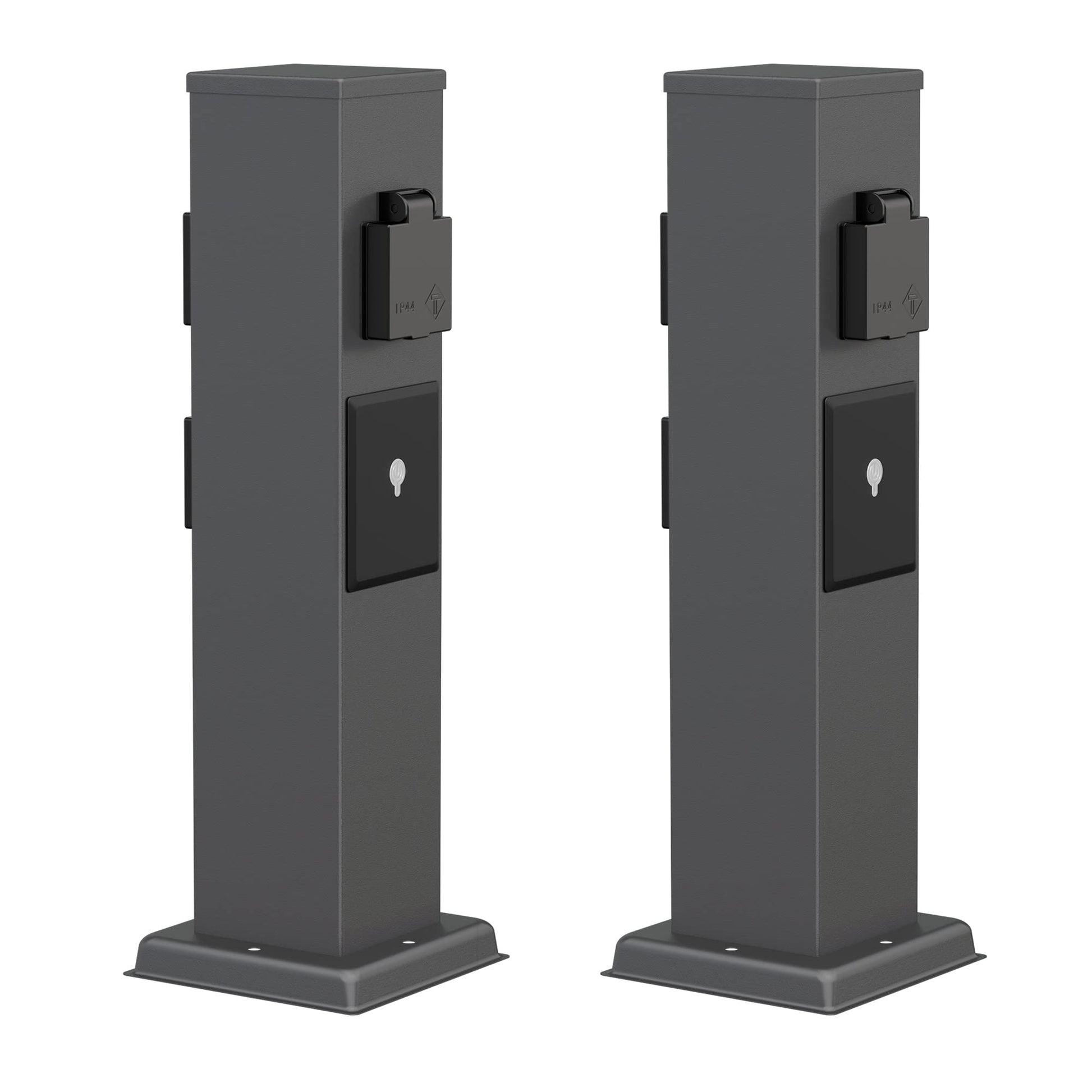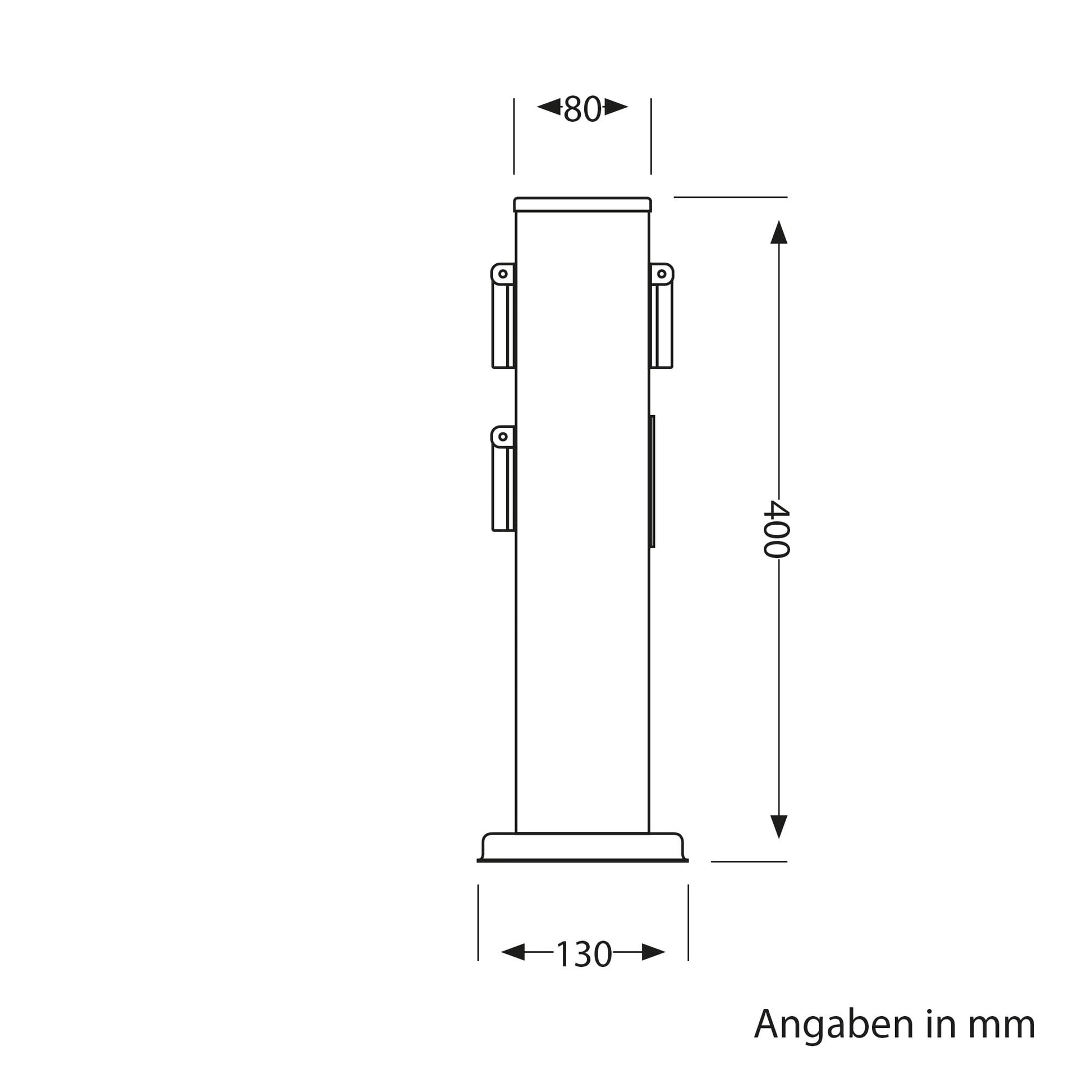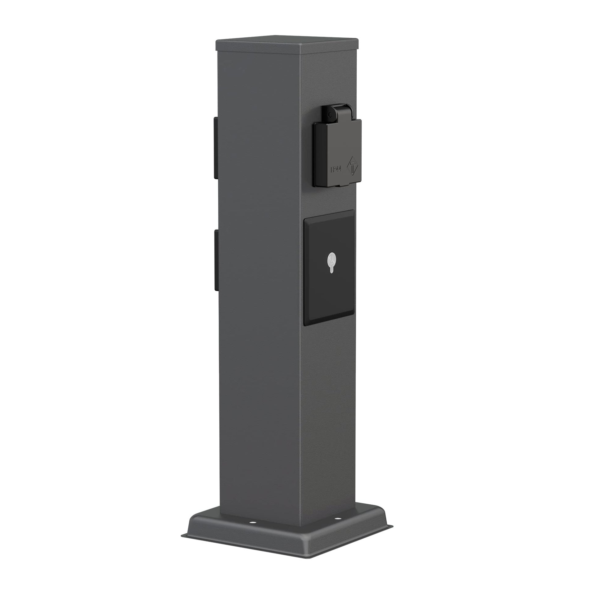Dank der widerstandsfähigen Konstruktion und der IP44-Zertifizierung ist die Steckdosensäule für den ganzjährigen Einsatz im Freien konzipiert. Der Anschluss erfolgt sicher und vor Feuchtigkeit geschützt über einen Kabelverbinder im Inneren der Säule, was eine dauerhaft zuverlässige Funktion gewährleistet.