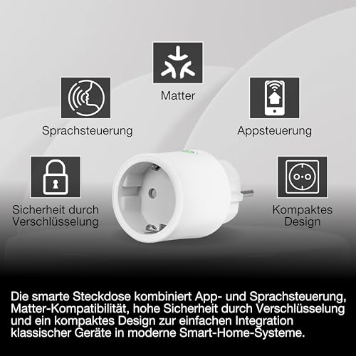 - Zukunftssicher dank Matter: Durch das Matter-over-WiFi-Protokoll (2,4 GHz) ist die Steckdose universell mit allen grossen Plattformen wie Amazon Alexa, Google Home, Apple Home und Samsung SmartThings kompatibel.