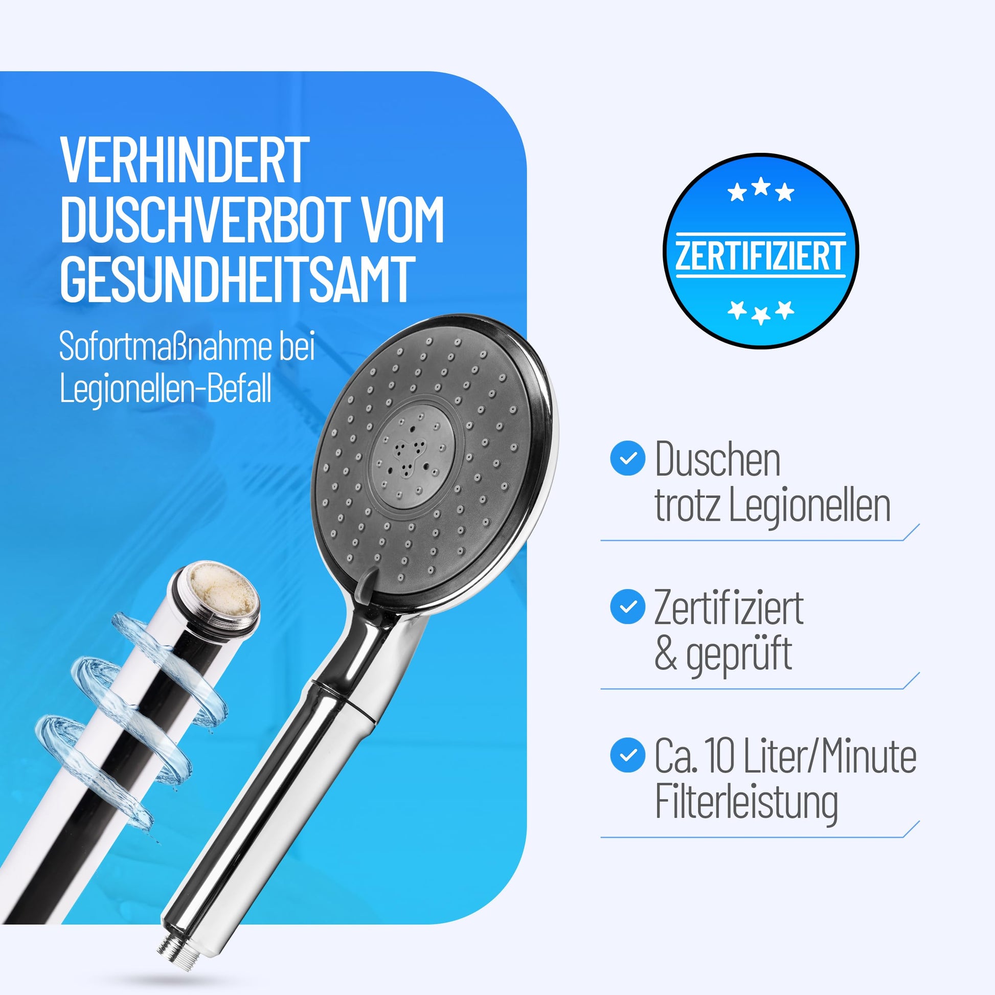 Schützen Sie sich, Ihre Familie, Mieter und Gäste wirksam vor den Gefahren einer Legionelleninfektion, die schwerwiegende gesundheitliche Folgen haben kann. Dank der zertifizierten Filtertechnologie nach ASTM F838-15AE1 vermeiden Sie zudem behördlich angeordnete Duschverbote und gewährleisten jederzeit hygienische Sicherheit.