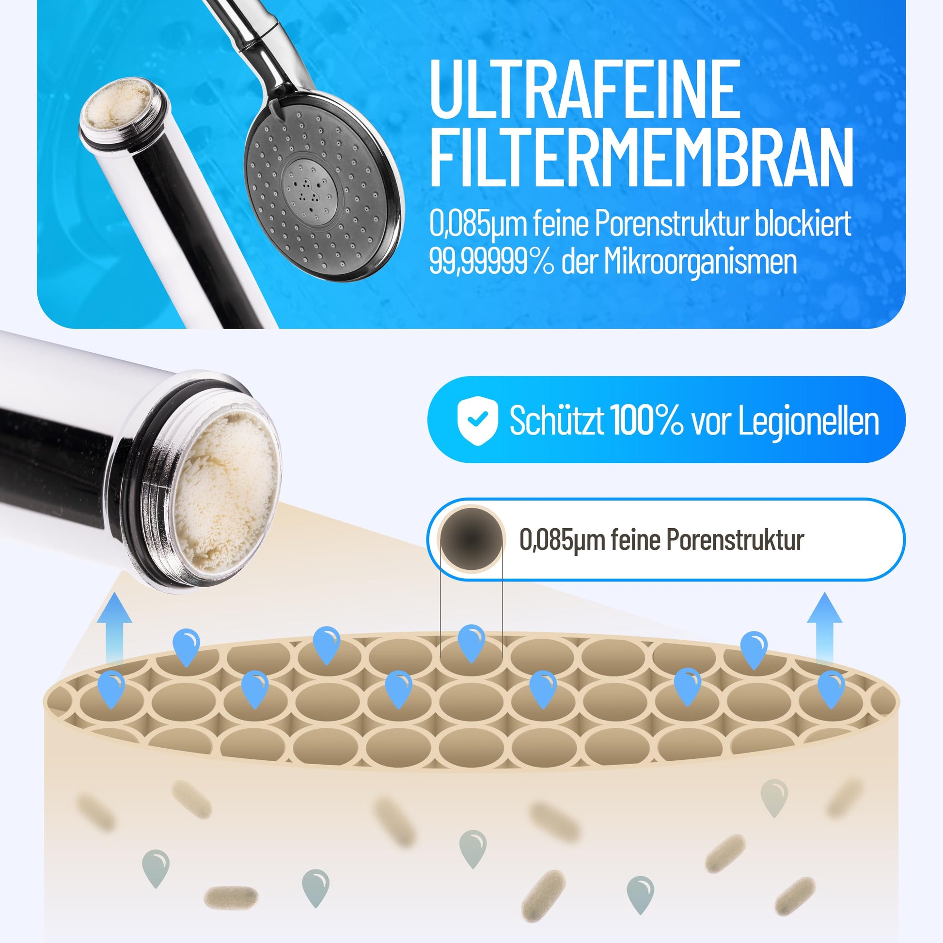 Der Duschkopf nutzt einen hocheffektiven Mikrofilter mit einer extrem feinen Porenfeinheit von nur 0,08 Mikrometern. Diese Porengrösse ist klein genug, um Legionellen und andere Bakterien physisch zurückzuhalten. Die Wirksamkeit ist offiziell nach dem medizinischen Standard ASTM F838-15AE1 zertifiziert, was Ihnen geprüfte Sicherheit garantiert.