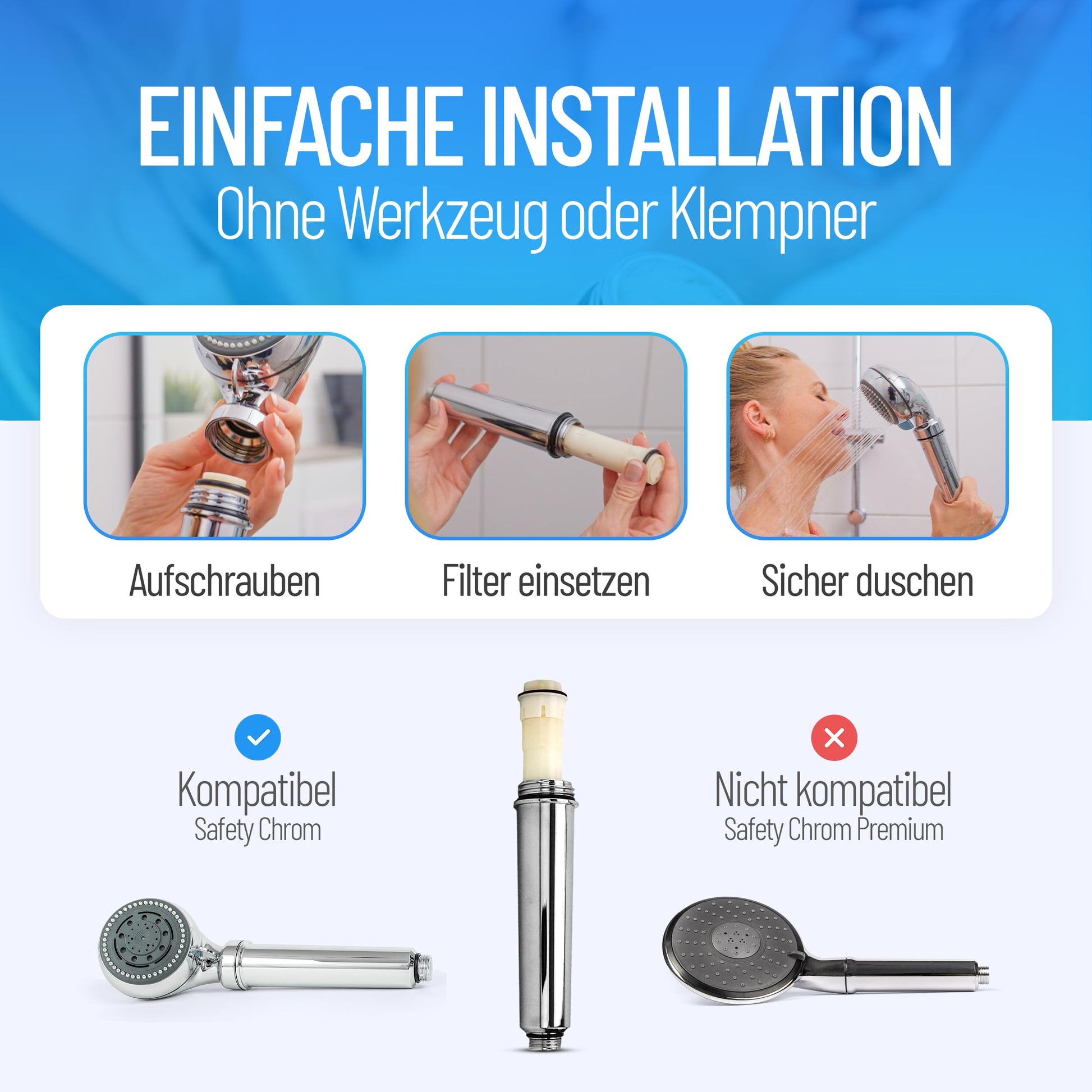 Nein, der Wechsel ist sehr einfach und ohne Risiko möglich. Sie müssen lediglich den Duschkopf aufschrauben, um die Patrone auszutauschen. Dieser Ersatzfilter ist speziell für das SAFETY CHROM Duschsystem von sanquell (Modellnummer 142) konzipiert.