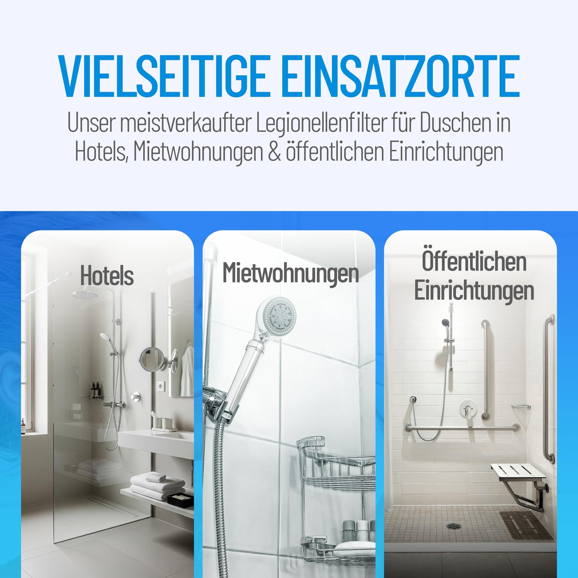 Geniessen Sie wieder ein unbeschwertes Duschvergnügen. Die hochwirksame Filterstruktur entfernt gefährliche Mikroorganismen aus dem Wasser und ermöglicht so die Aufhebung eines bestehenden Duschverbots. Sie bietet höchsten Schutz vor der Legionärskrankheit und damit verbundenen Risiken wie Lungenentzündungen.