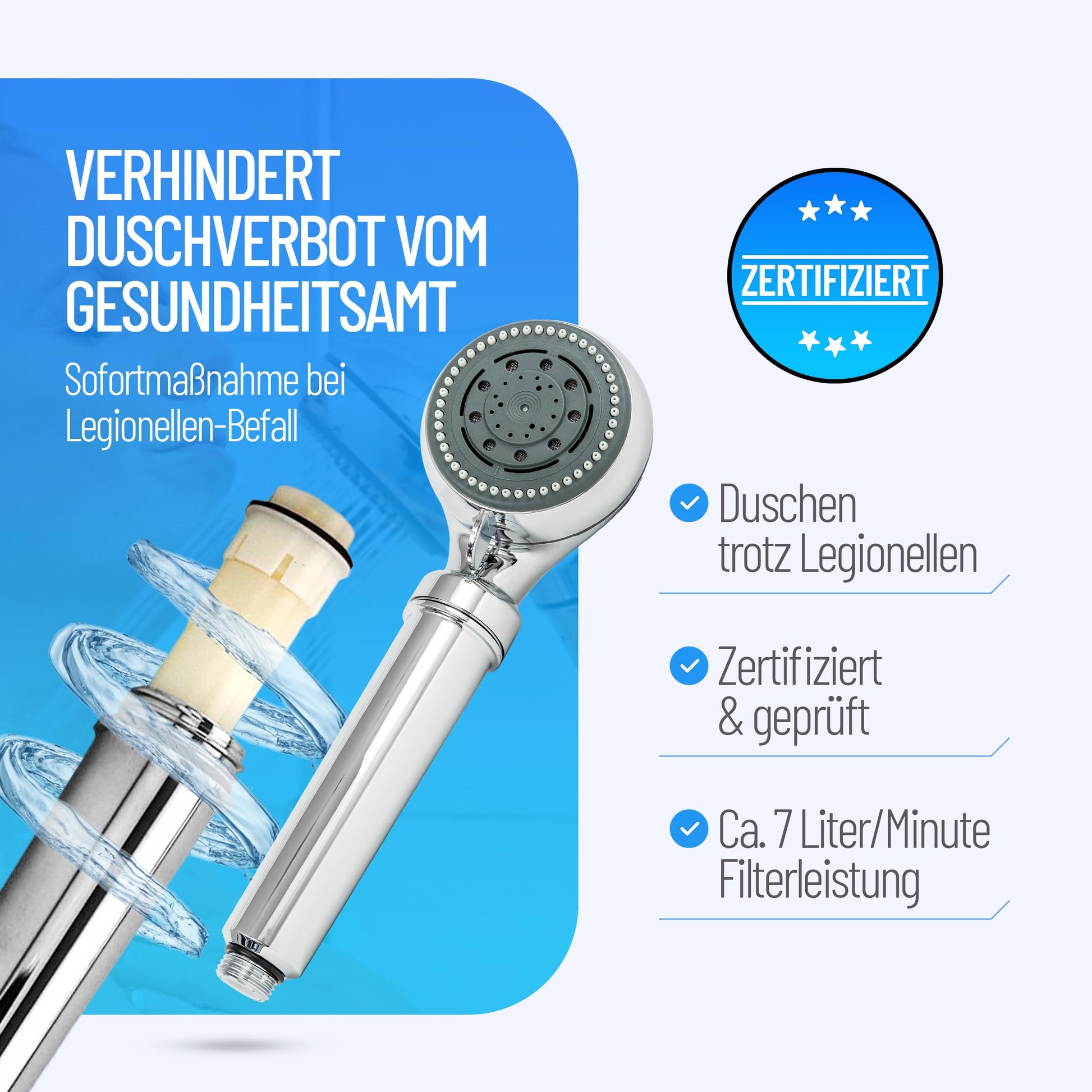 Dieser zertifizierte Filter schützt zuverlässig vor Legionellen und anderen Mikroorganismen. Dank seiner extrem feinen Porenstruktur von 0,15µm hält er bis zu 99,999999% aller Keime im Duschwasser zurück und bietet so höchsten Schutz vor der Legionärskrankheit.