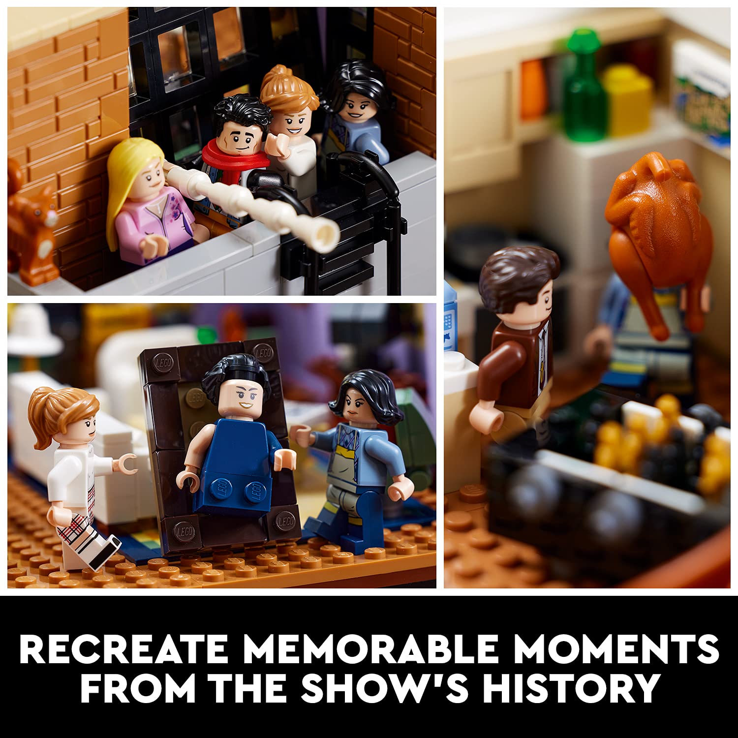 Das Set enthält 2.048 Teile zum Nachbau von Monica & Rachels sowie Joey & Chandlers Apartments, inklusive des verbindenden Flurs. Enthalten sind außerdem 7 Minifiguren der gesamten Clique plus Janice sowie zahlreiche Zubehörteile, die auf ikonische Szenen anspielen, wie der Thanksgiving-Truthahn oder Phoebes "Gladys"-Gemälde.