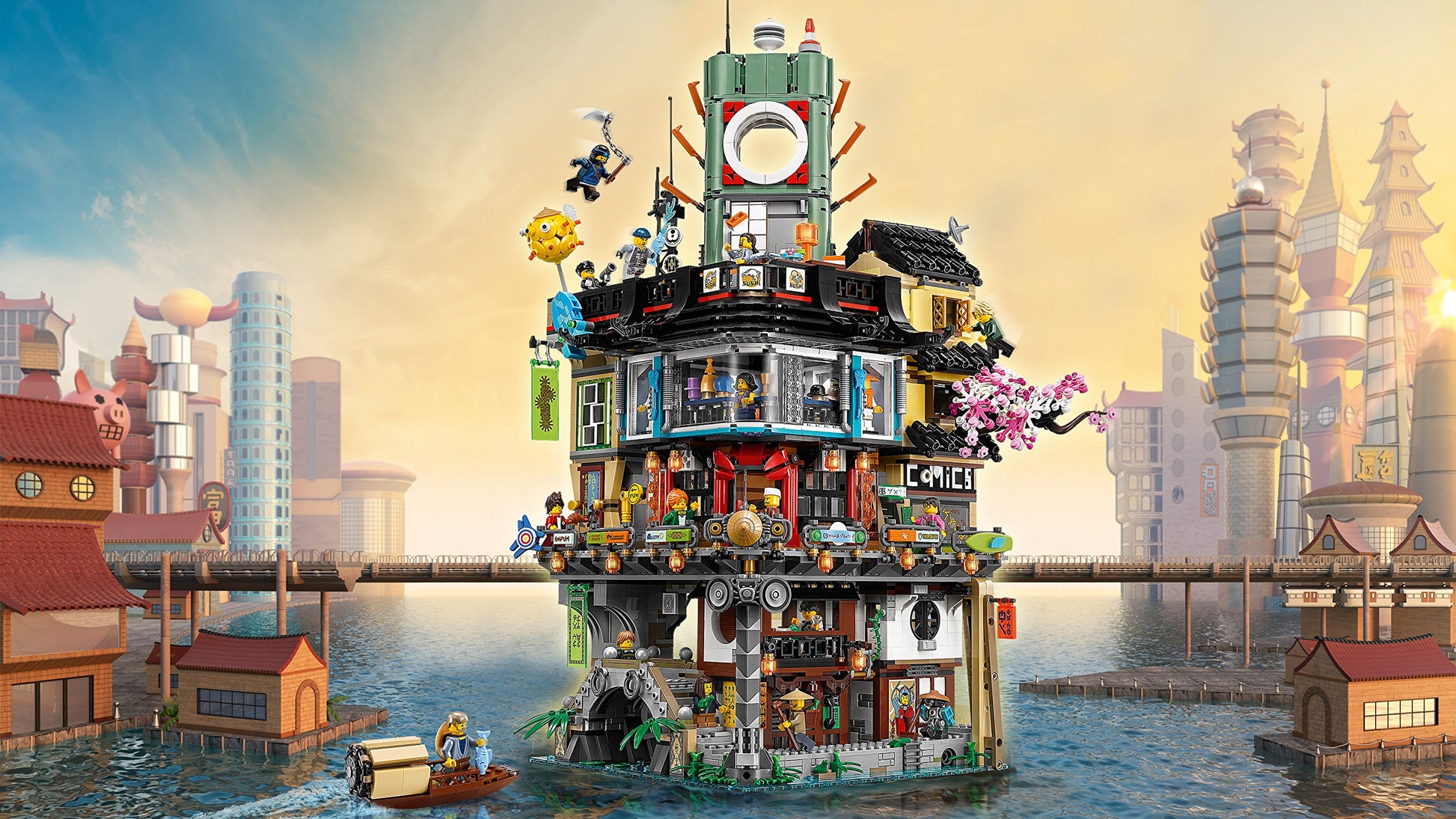 NINJAGO City erstreckt sich über drei detailreiche Ebenen mit zahlreichen Funktionen: ein traditioneller Fischmarkt, ein funktionierender Aufzug, eine Sushi-Bar mit Förderband, ein Modegeschäft, ein Comic-Laden und viele versteckte Details, die zum Erkunden und Spielen einladen.