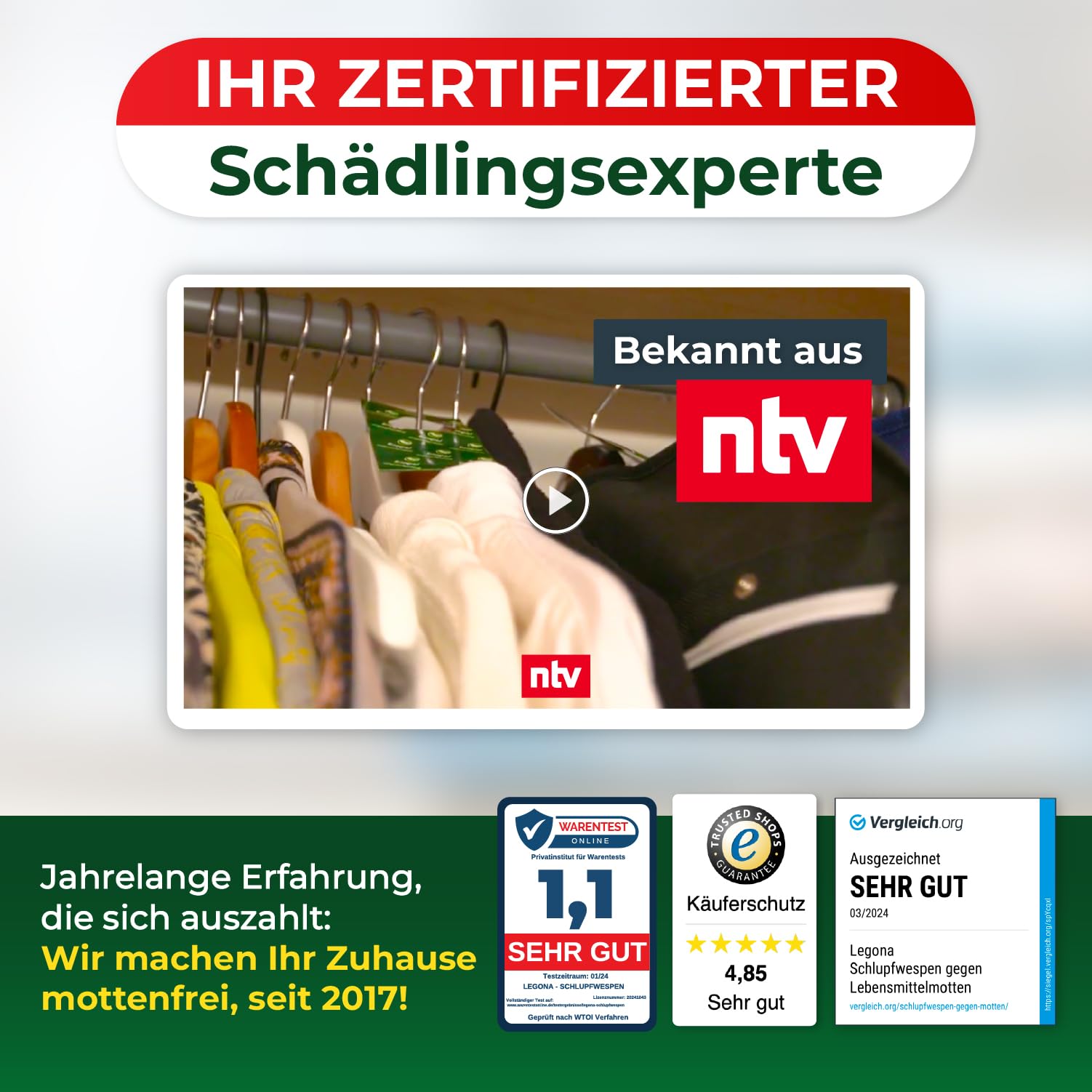 Garantierte Frische: Sie erhalten ausschliesslich zuchtfrische Schlupfwespen, die sofort nach der Zucht versandfertig gemacht werden. Dies sichert die bestmögliche Qualität und Wirksamkeit für Ihren Mottenschutz.