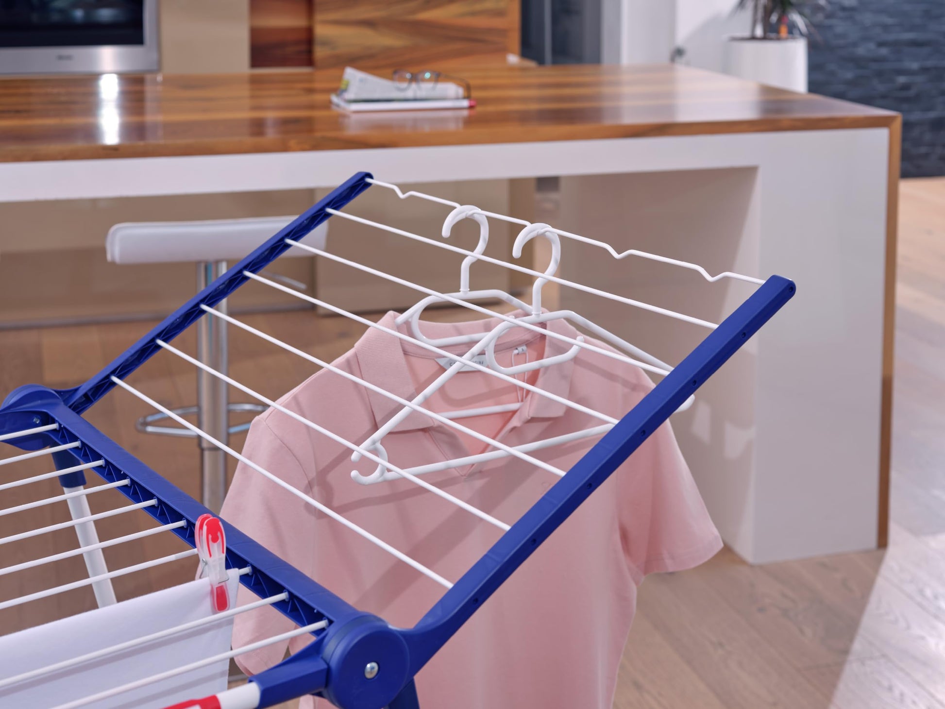- Hohe Seitenteile: Die seitlich ausklappbaren Flügel haben eine Höhe von 107 cm und eignen sich dadurch ideal zum Aufhängen von langen Wäschestücken wie Hosen oder Badetüchern.