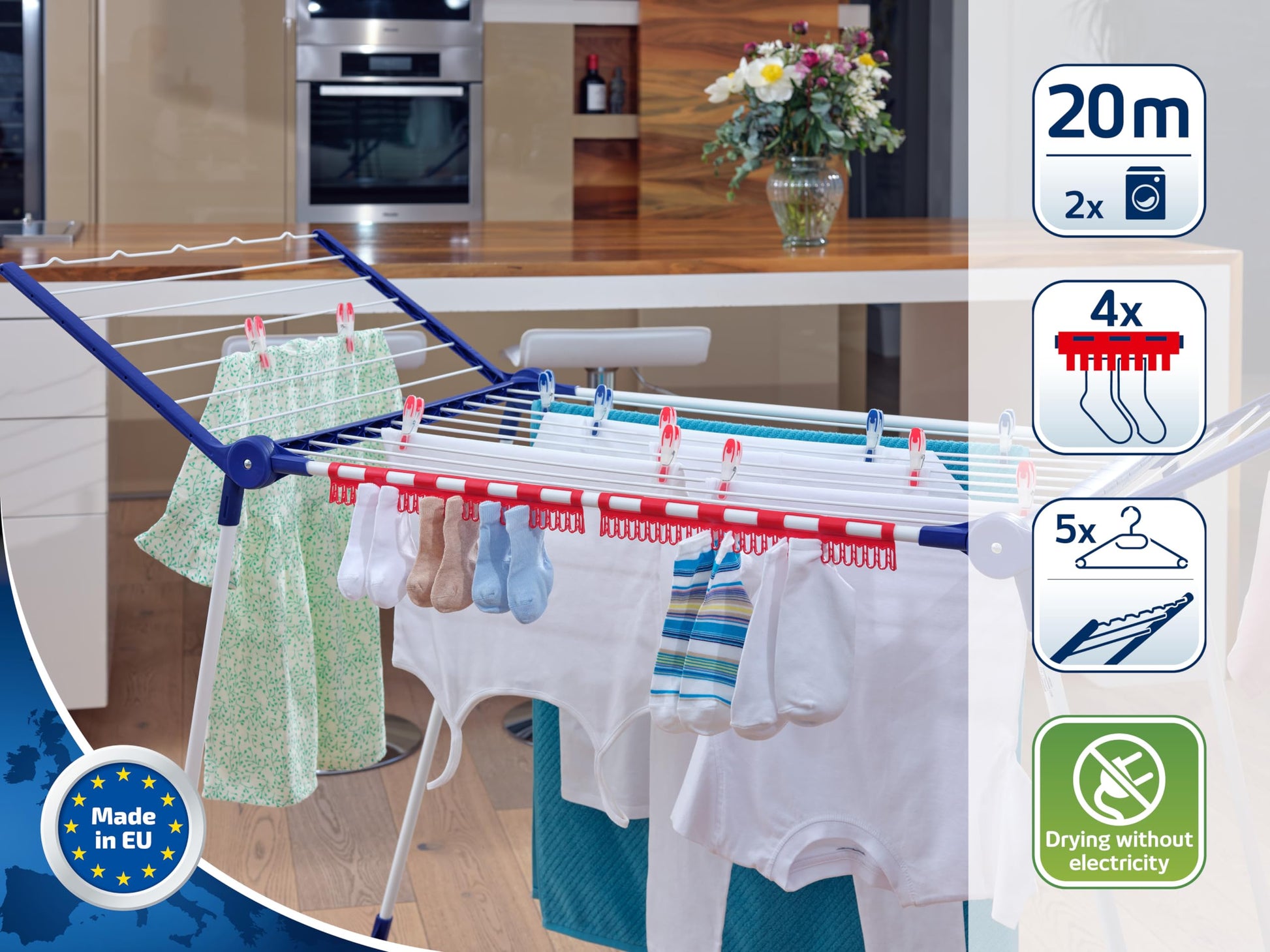 - Grosse Kapazität: Mit einer Trockenlänge von 20 Metern bietet der Ständer ausreichend Platz für bis zu zwei komplette Waschmaschinenladungen.