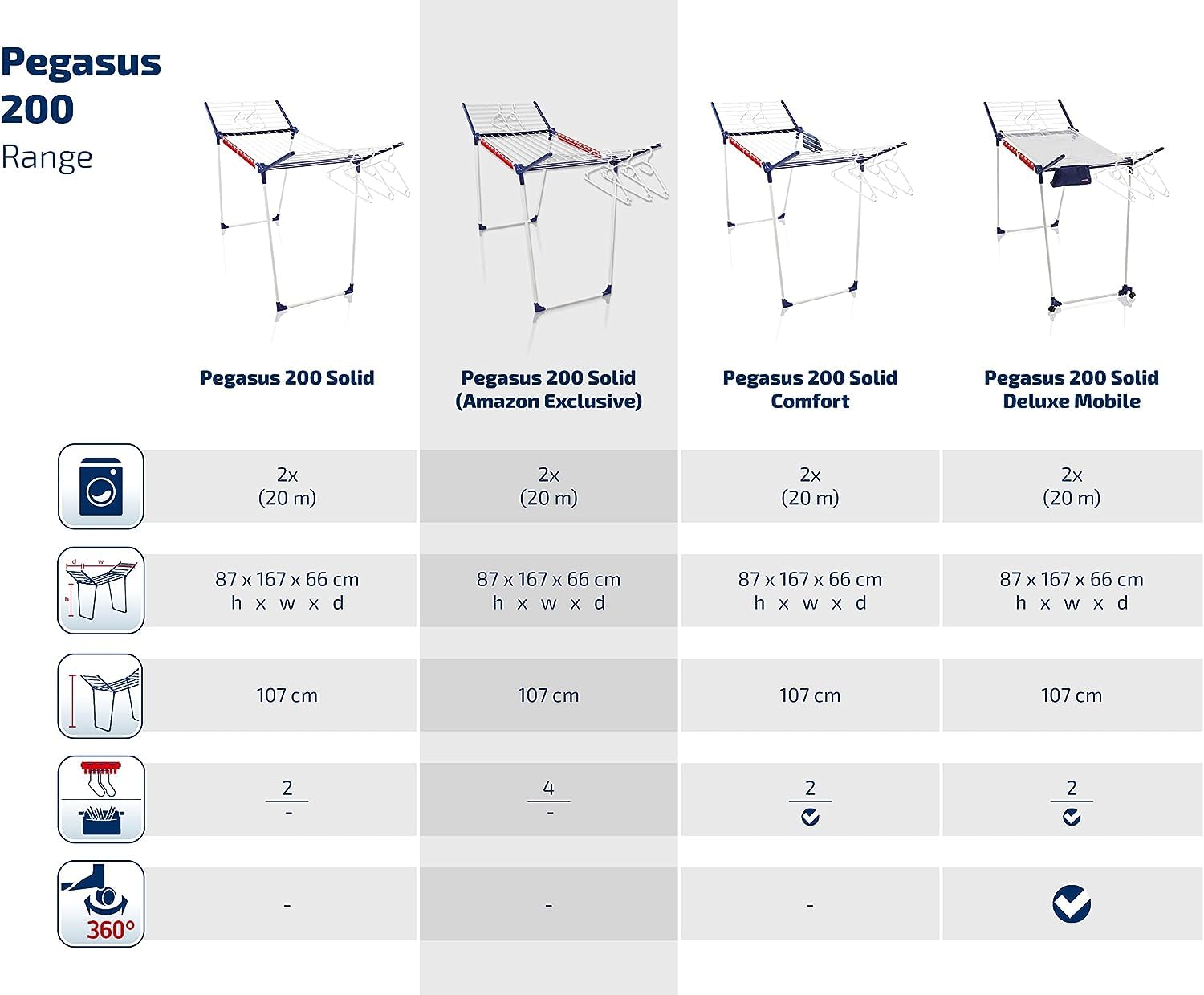 Der Standtrockner Pegasus 200 Solid ist die durchdachte und stabile Lösung, um grosse Wäschemengen effizient an der Luft zu trocknen. Mit seiner grosszügigen Kapazität und dem cleveren Zubehör wird er zum unverzichtbaren Helfer im Haushalt.