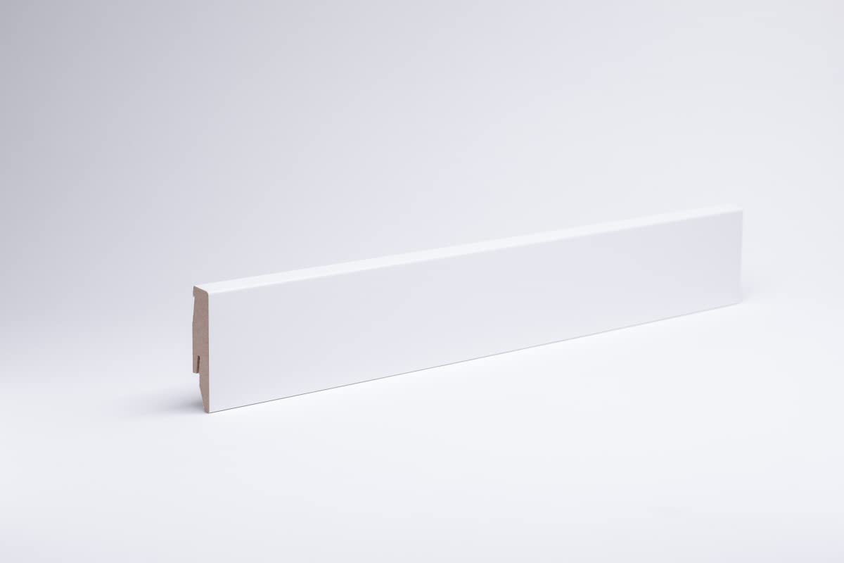 Die Fussleisten haben einen stabilen Kern aus MDF (mitteldichte Faserplatte) und sind mit einer schützenden, weissen Dekor-Folie ummantelt. Diese Oberfläche ist stoss- und kratzfest, was die Leisten langlebig und widerstandsfähig im Alltag macht.